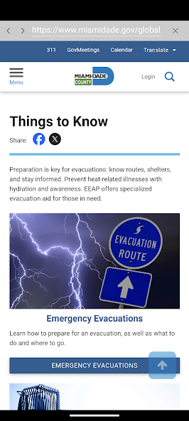 The Ready Miami-Dade mobile app provides Miami-Dade residents and visitors with up-to-the minute information before, during and after a hurricane. Additional features include: