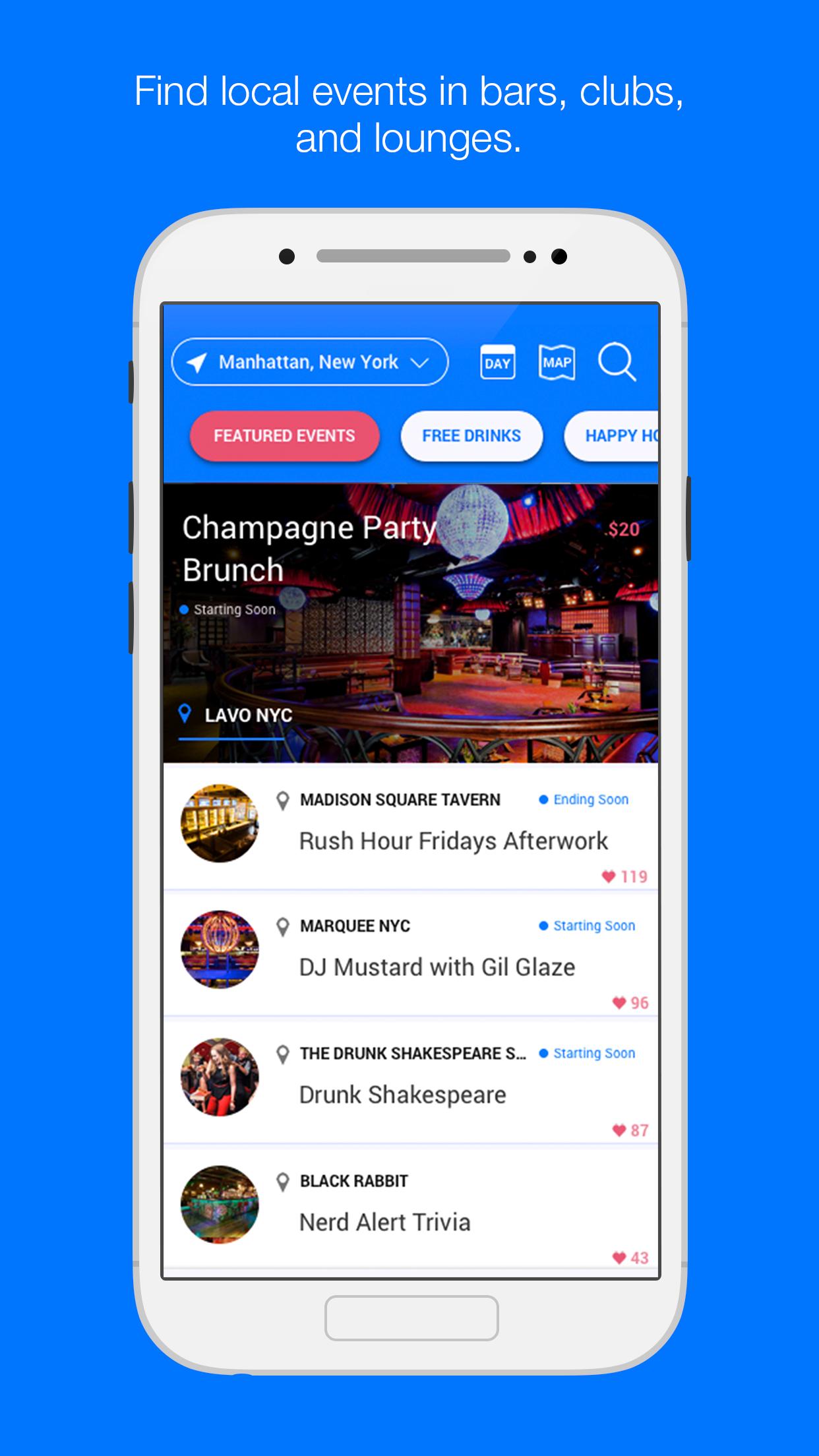 Find events such as happy hours, comedy shows, karaoke, live music and more...