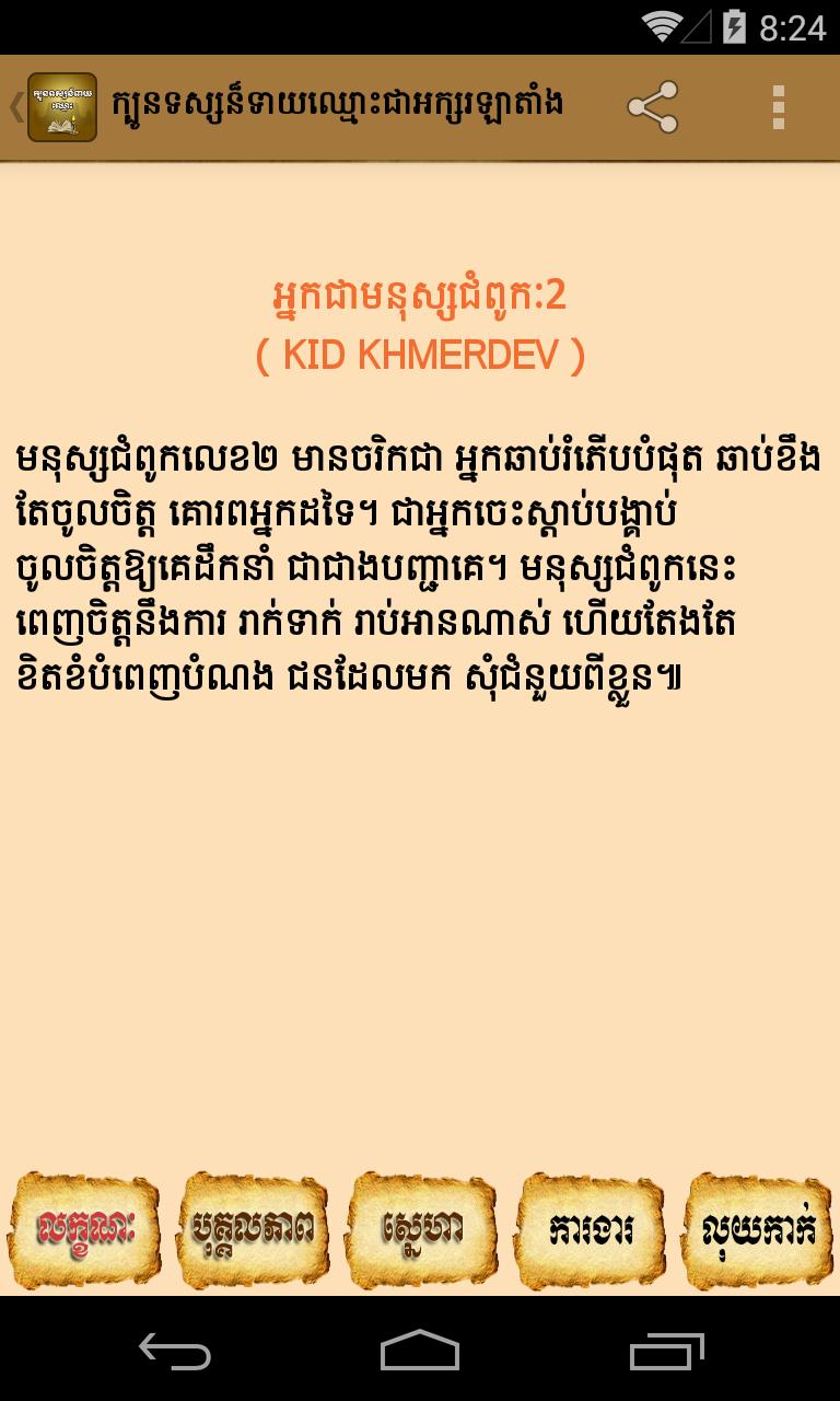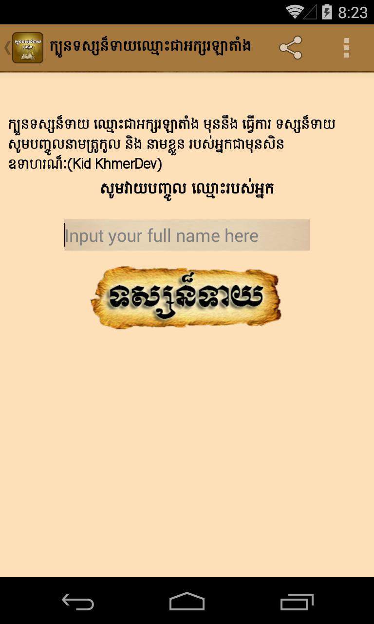 Khmer Fortune-Teller is an application that is created for predictions on Attribute, Character, Love, Work and Wealth of destiny of each person by Latin Name base on Napoleon.