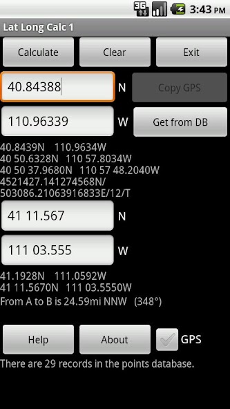 Lat Long Calc is a GPS tool that converts latitude/longitude coordinates to different formats and calculates distance and direction between two points. This is the free version. For more features look for Lat Long Calc Pro.