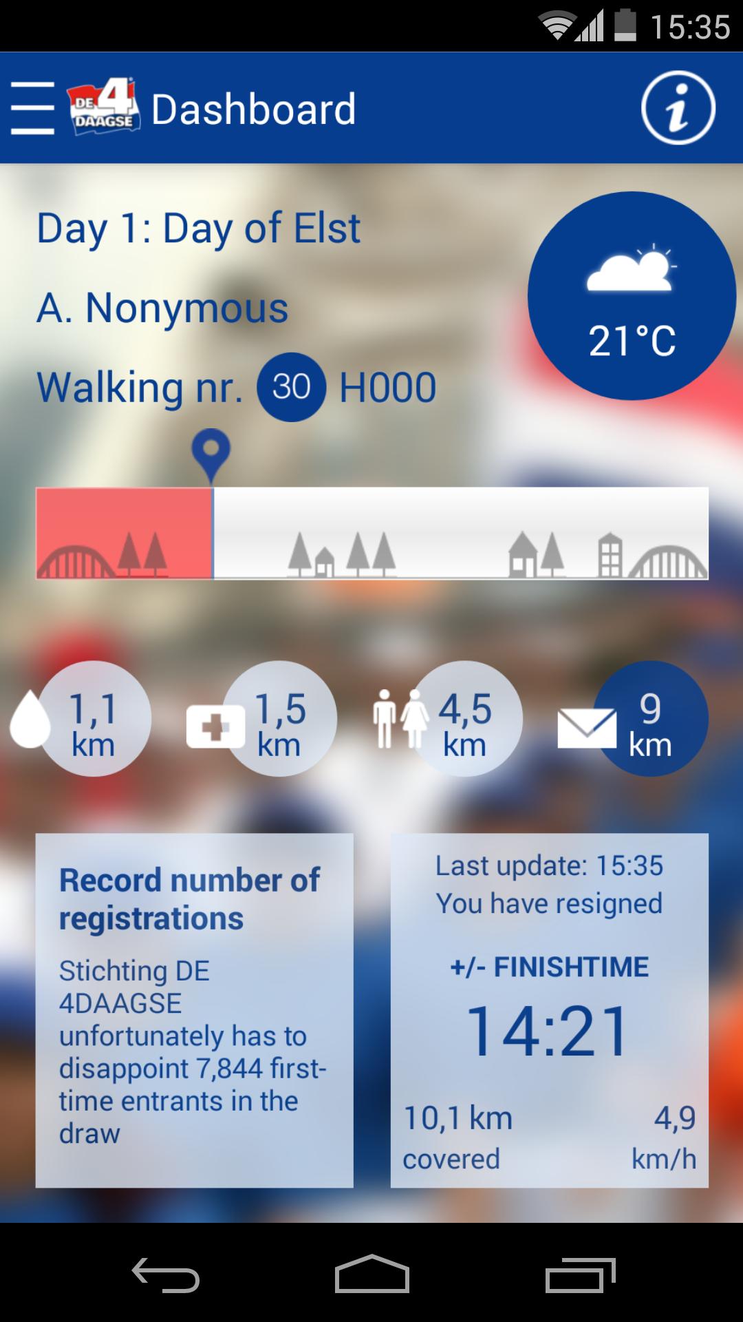 This official Four Days Marches app is published by Stichting DE 4DAAGSE. This app is meant for participants of the Four Days Marches. As a participant you have sign in with your 4DAAGSE registration number (not your walker number) and your date of birth. Adding a nickname and your phone number will make it easy for other to follow you.