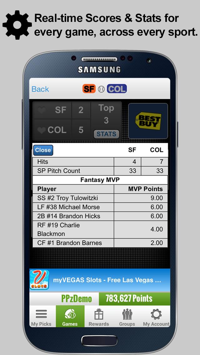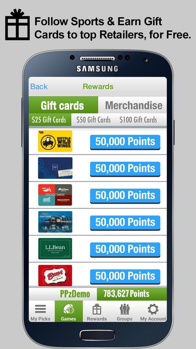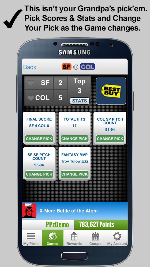 PickPointz is the ultimate mobile sports app made for true sports fans. Earn rewards for picking the final score or stats for football, basketball, baseball or hockey. Make your picks, stay in the game, and as the game changes, so can your picks, right up to the end of the game. Predict the correct score or stats earlier and earn more points. It’s that simple.