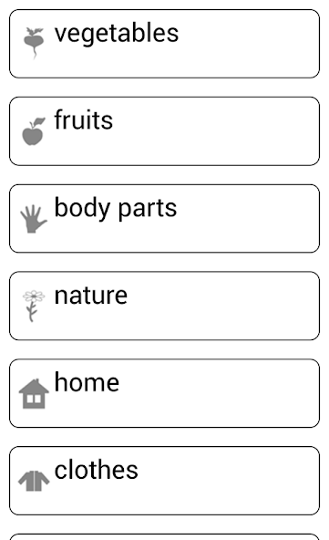 The app contains the following topics: vegetables and fruits, wild animals, domestic animals, animal body parts, birds, sea life, home, bathroom, clothes, colors, transport, human, body parts, tableware, home appliances, food, toys, school, nature, natural phenomena, insects, numbers and figures, geometric shapes, musical instruments, tools, sport, summer sports, winter sports, travel, entertainments, office, infrastructure, shop, society, professions, information technology, prepositions.