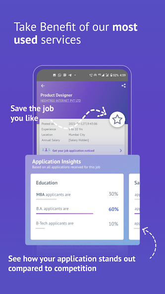 The app comes with a ‘Job for You’ section to get jobs matching your preferences and skills. Additionally, you can check and track the jobs you’ve saved and applied for in the past. You can use it at your convenience if the saved jobs are available then later.