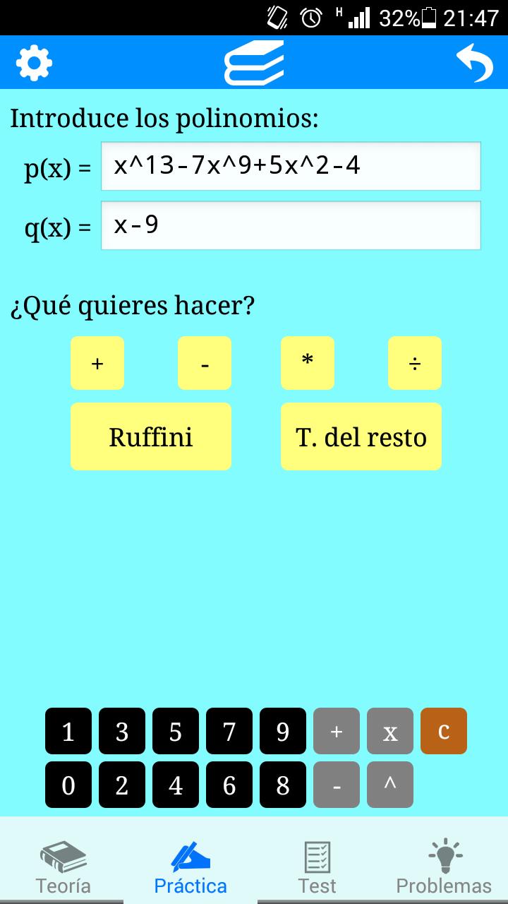 - Practice: allows the resolution of basic operations with Polinomios , decomposition of these through the rule of Ruffini, as well as an interpretation of the theorem of the rest.