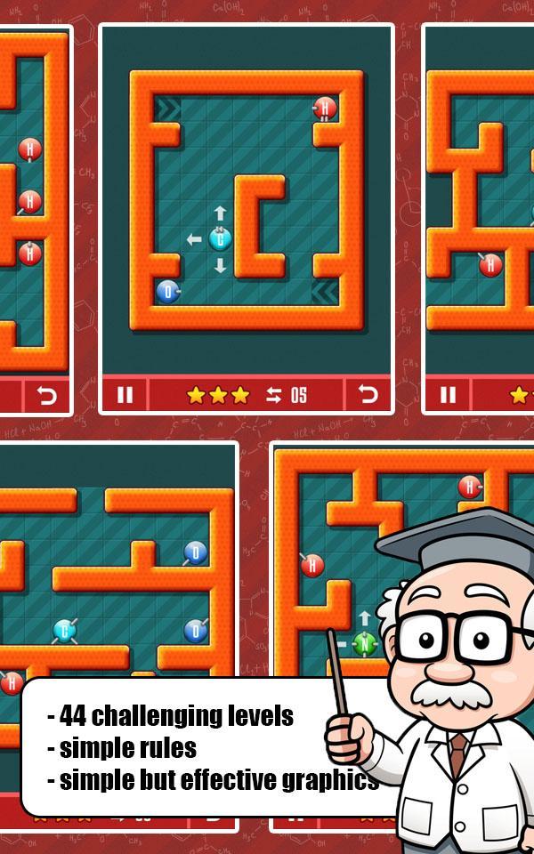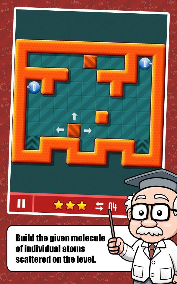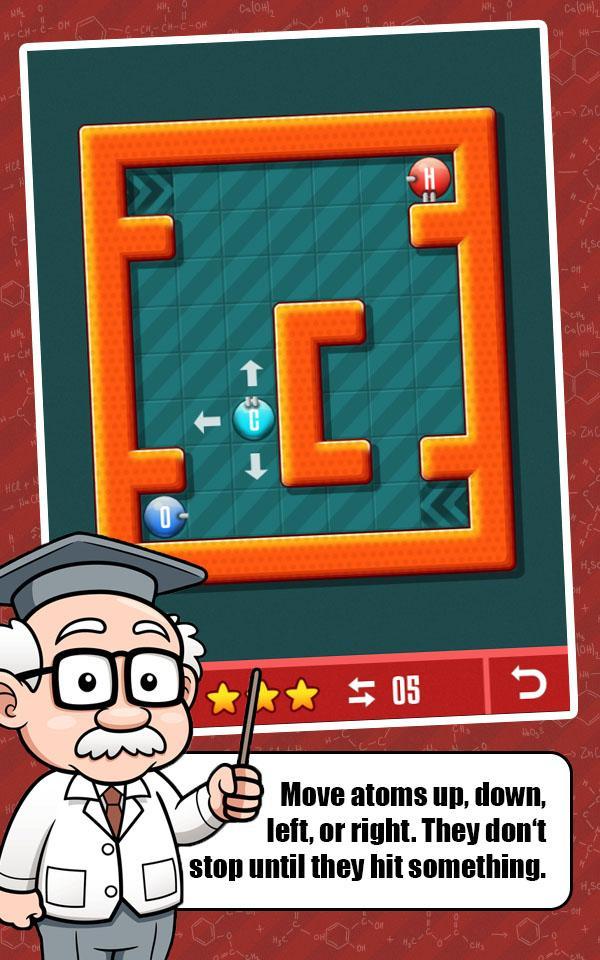 هدفك بسيط. بناء جزيء معين من الذرات الفردية المنتشرة على المستوى. يمكنك تحريكها إما لأعلى أو لأسفل أو يسار أو يمين. بمجرد أن تبدأ الذرة في التحرك ، لن تتوقف حتى تصل إلى ذرة أو جدار أو قرميد آخر. بسيطة بما فيه الكفاية ، أليس كذلك؟