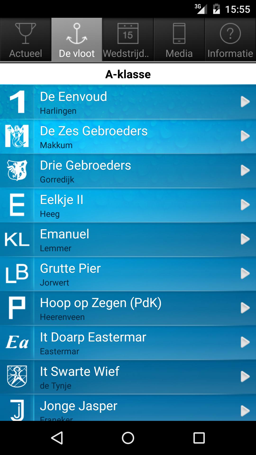 - teilnehmende Skûtsjes (pro Klasse mit Foto, Skipper, Segelzeichen und Eigenschaften des Skûtsje)