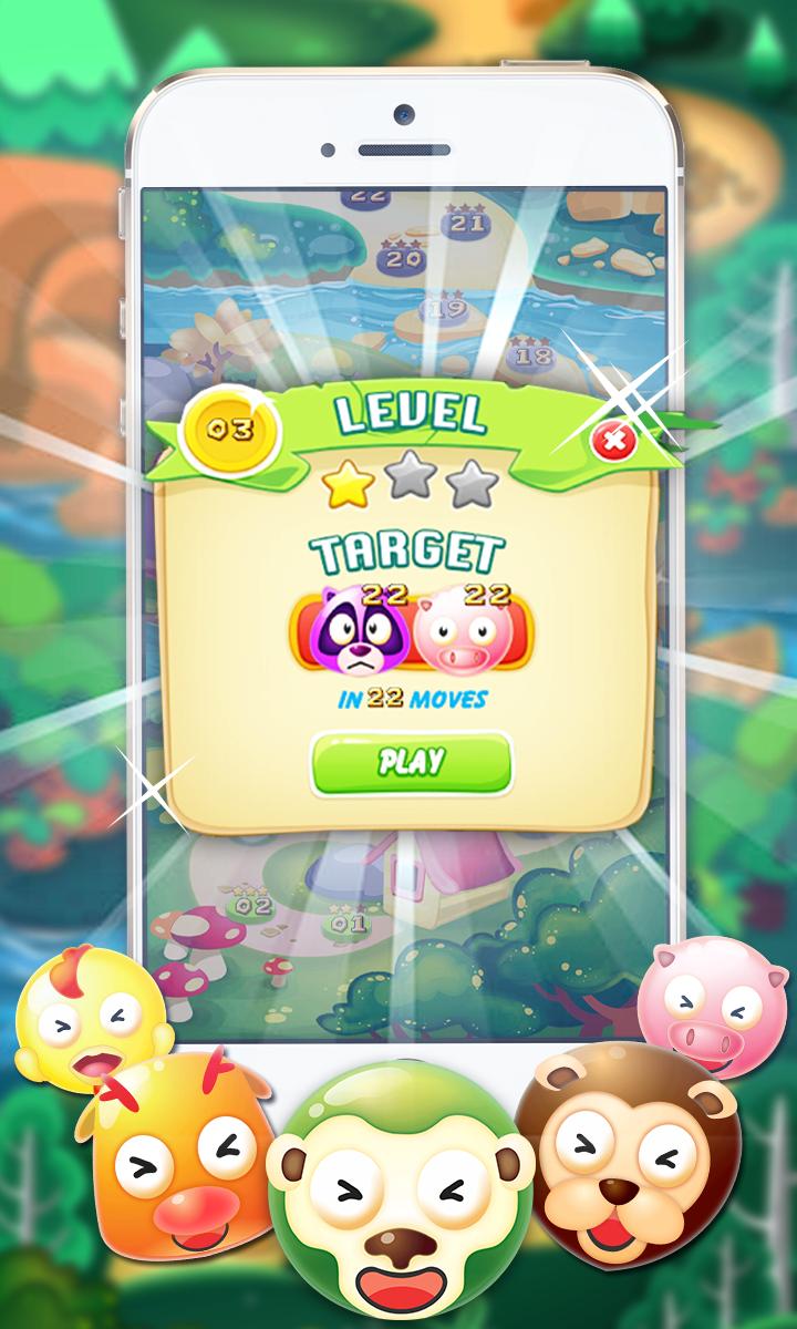 ● Um Punkte zu erhalten, müssen Sie nur 3 oder mehr Emoji der gleichen Art von geraden horizontalen oder vertikalen oder diagonalen Linien einstellen und sie explodieren lassen.