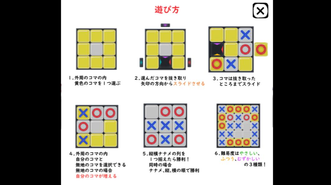 Es ist ein Spiel, bei dem Sie in zwei Lager aufgeteilt werden, 〇x, und eine der Figuren um Sie herum auswählen und sie von der gegenüberliegenden Seite hineinschieben, um 5 Punkte vor Ihrem Gegner zu erreichen.