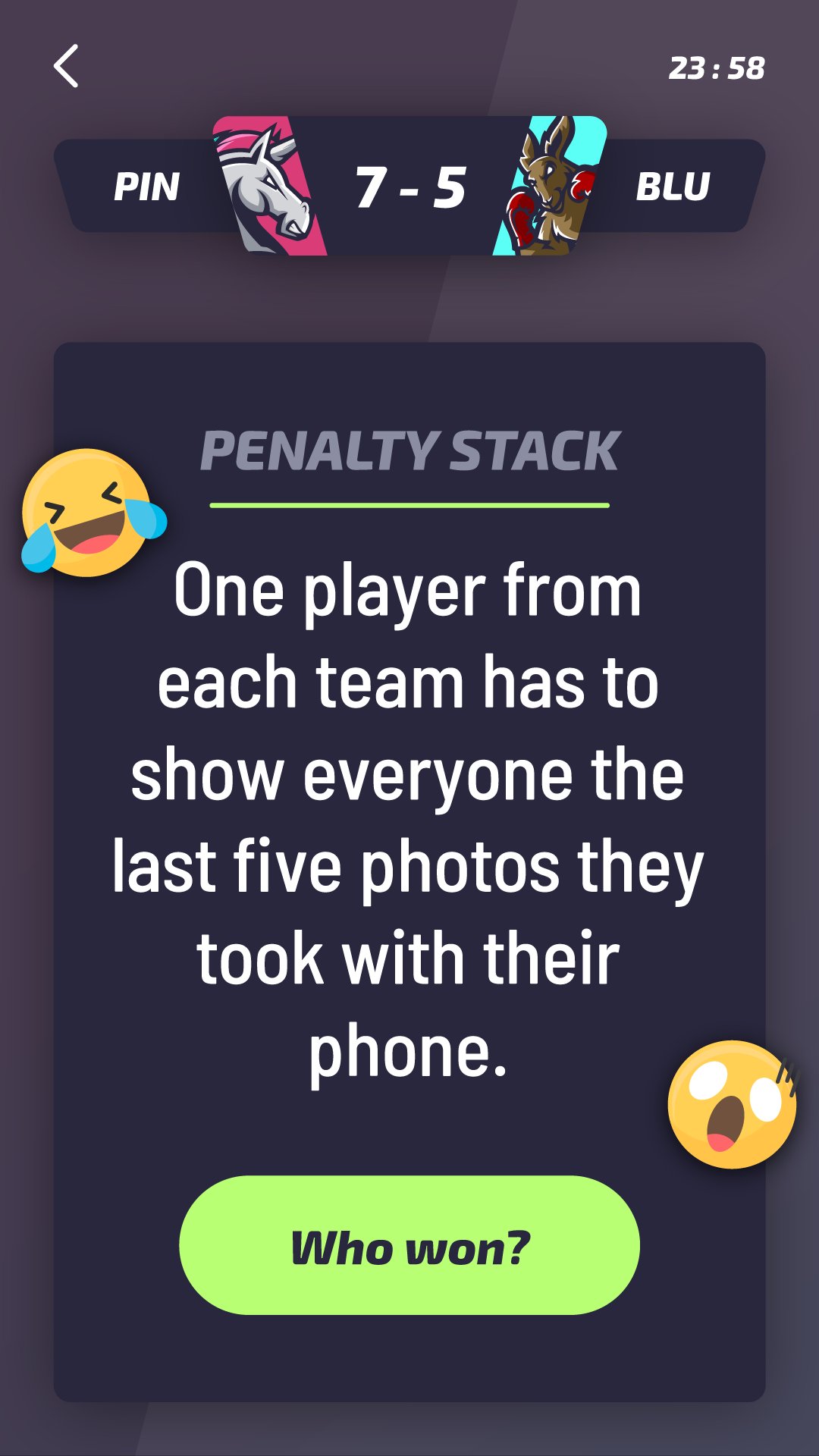 Teams treten in verschiedenen Herausforderungen und Spielen gegeneinander an, genau wie bei einem echten Sport. Die Verlierer müssen die Strafschüsse trinken und die Gewinner werden zum Trinkchampion gekrönt.