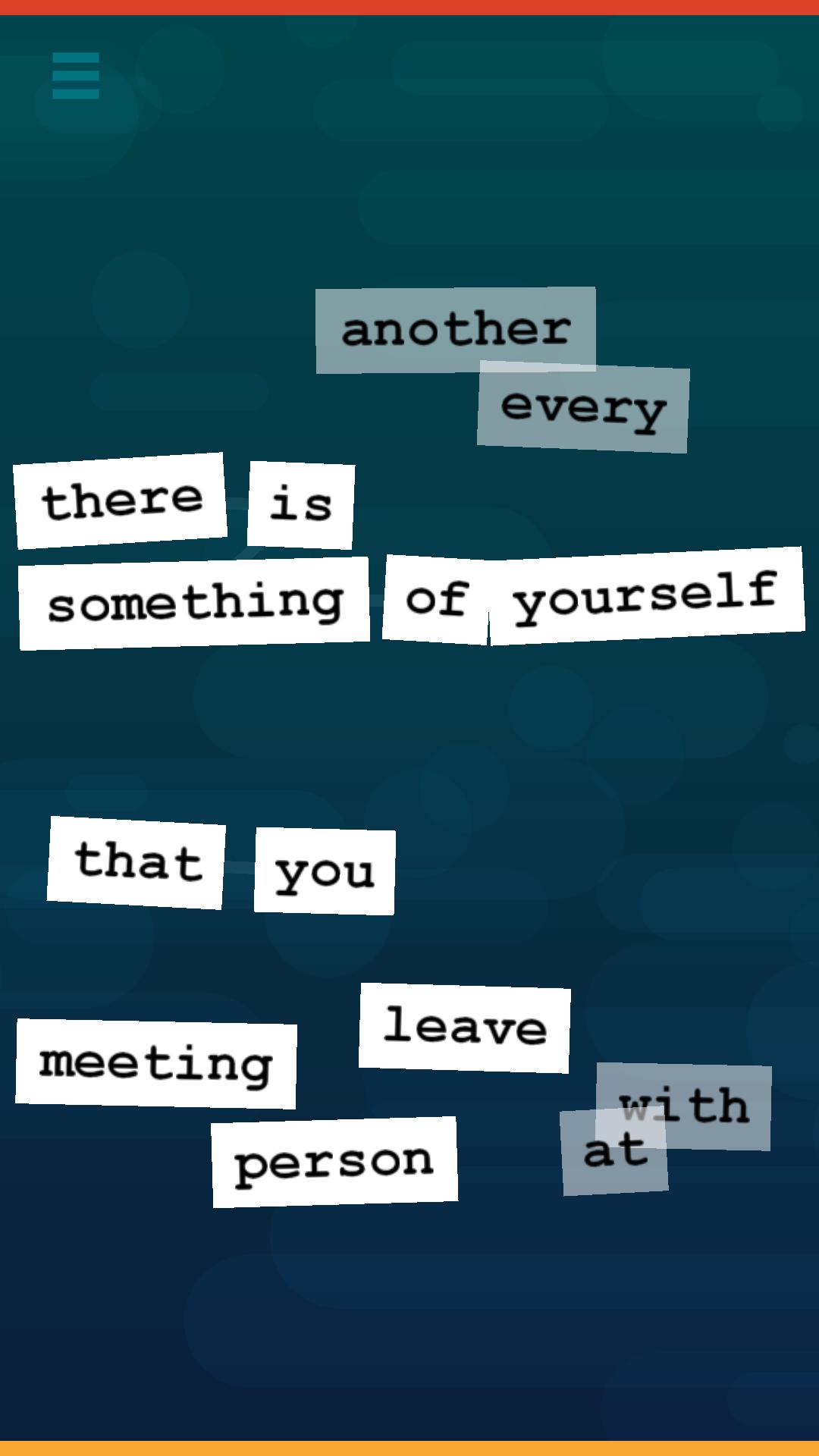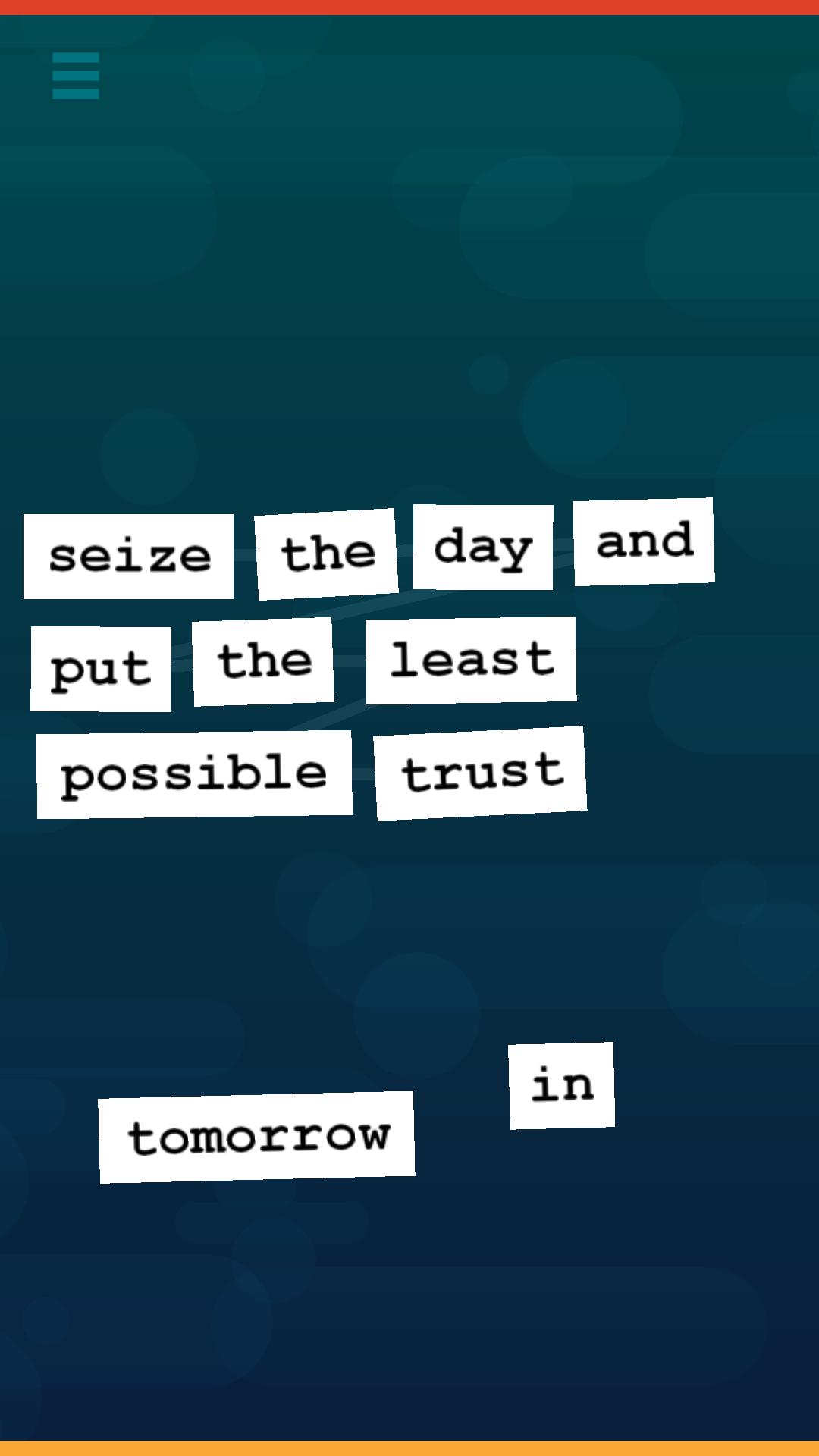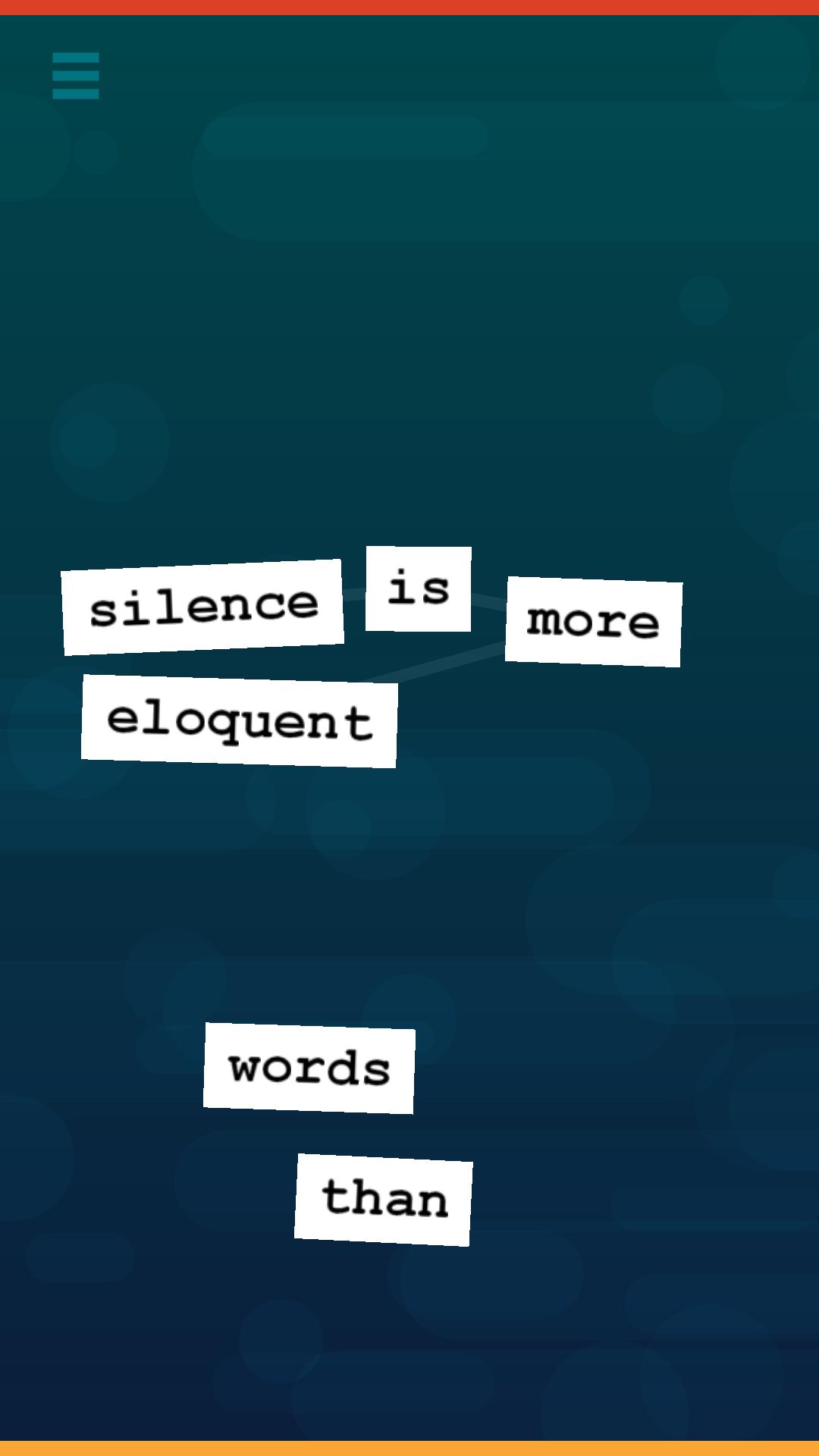 Entschlüsseln Sie die Worte, um inspirierende Zitate von berühmten Philosophen, Führern, Autoren, Musikern und vielem mehr aufzudecken. Quota bietet ein einfaches, aber einzigartiges Gameplay -Konzept, das die allgemein beliebten Wortmagnete erinnert.
