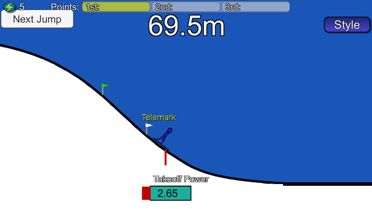 Obtenga puntos como en un verdadero salto de esquí. Salta más y haz un aterrizaje con estilo telemark para obtener más puntos.