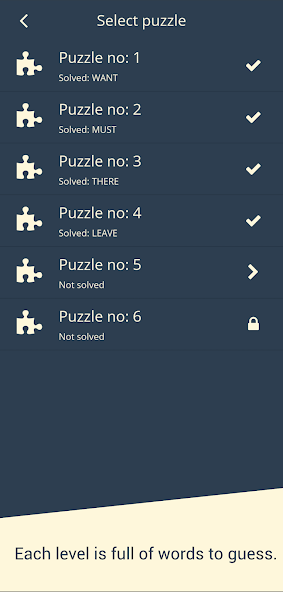 ◾ El juego contiene docenas de niveles (temas). Cada nivel es una docena de palabras para adivinar. Tienes que adivinar las palabras para desbloquear el siguiente nivel.
