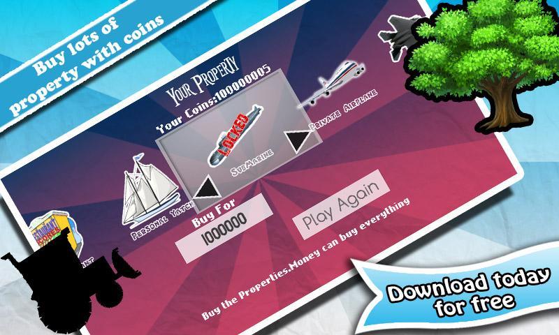 ★ Use monedas para desbloquear artículos de alta gama, el automóvil deportivo, el jet, incluso comprar la Tierra.