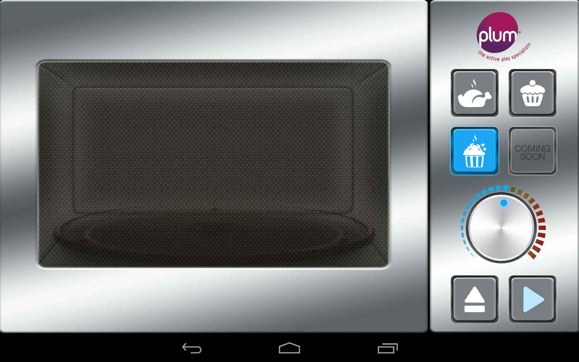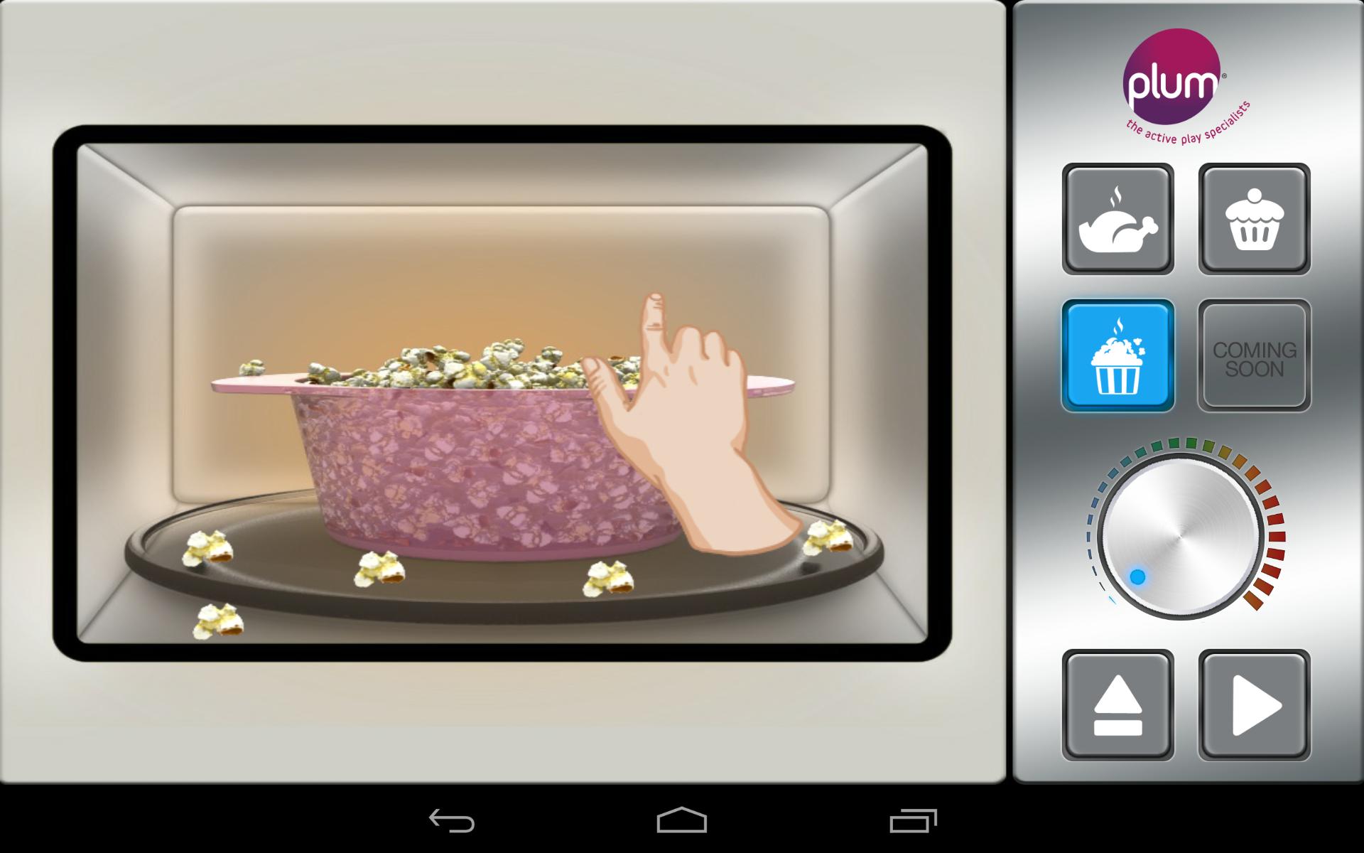 Esta divertida aplicación da vida a la cocina para niños de todas partes con juegos locos y animación genial. ¿Quieres hacer palomitas de maíz en el microondas? Select popcorn on the app's microwave, turn the dial to set the timer, press start and watch the popcorn pop! La aplicación Plum Interactive Kitchen viene con una variedad de tipos de alimentos para seleccionar y cocinar. La aplicación familiariza a los niños con números y tiempo y siempre termina con un divertido juego de limpieza.