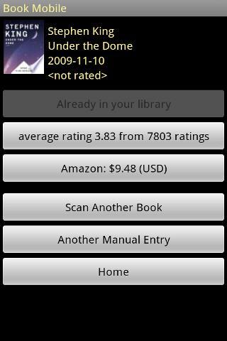 Catalogue votre bibliothèque personnelle à la maison ou dans le magasin (pas un lecteur de livres). Book Mobile analysera le code-barres ISBN, recherchez le livre dans votre bibliothèque Google.books.com. Vous pouvez l'ajouter. Vous pouvez lire les critiques et les notes, comparer sur Amazon ou suivre les liens de menu vers plus d'informations.(1.8) Intégration avec Amazon sur l'écran de résultat de recherche.