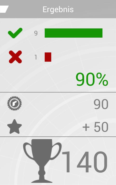 Même si vous jouez en mode unique, vous pouvez bien sûr marquer avec diligence et collecter des points supplémentaires avec dix réponses réelles. De plus, il existe un mode üb dans lequel ni les réponses fausses ni correctes n'affectent l'état du compte Point. Ici, vous pouvez également limiter les questions à certaines catégories (automobile, défense, lieux, curiosités, ...).