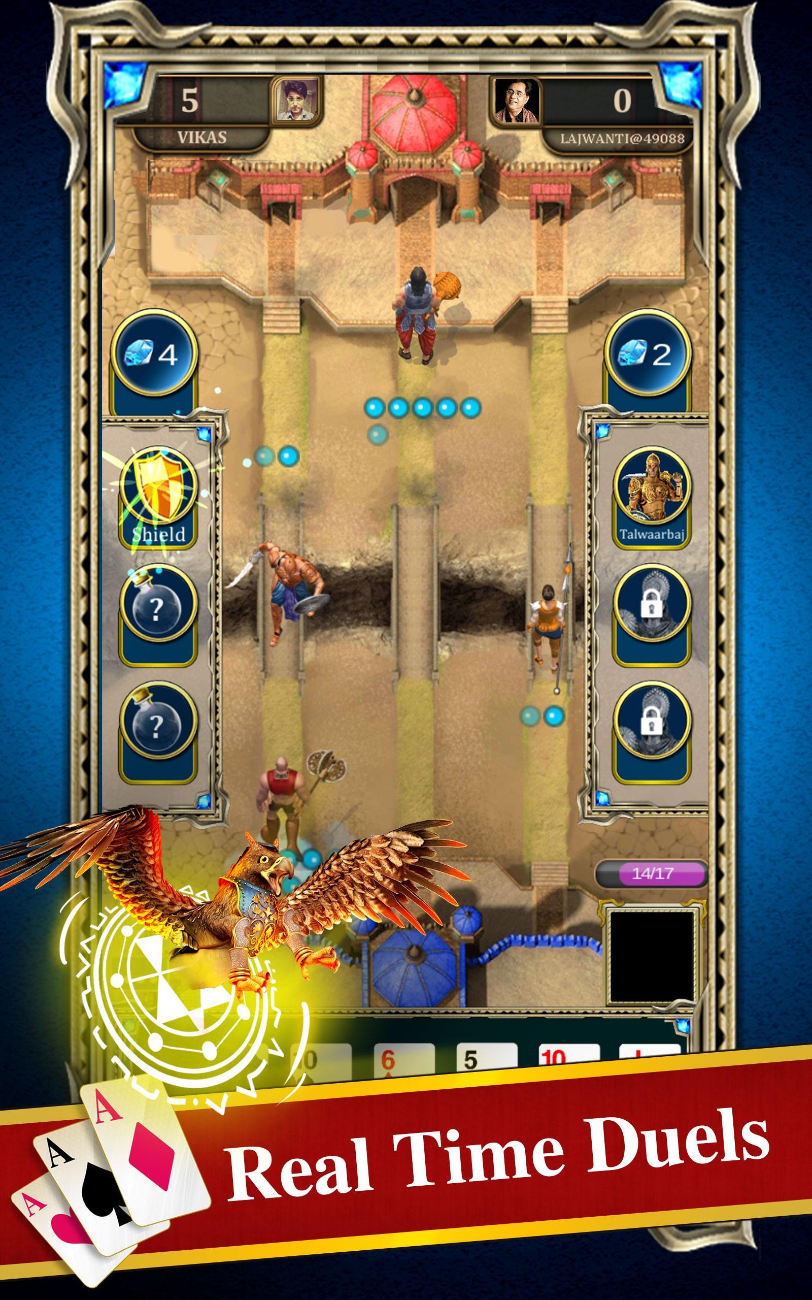 Découvrez un jeu unique, utilisez vos compétences Teen Patti et laissez-nous vous emmener à un tour fantastique. Déployez le meilleur adolescent Patti à remettre les six cartes dont vous disposez et nous le transformerons en soldat. Certaines mains débloquent également des sorts spéciaux qui vous aideront à battre l'adversaire. Choisissez intelligemment vos cartes ou les économisez sagement pour plus tard. Élaborer une stratégie comme vous le souhaitez, endommager le château de l'adversaire.