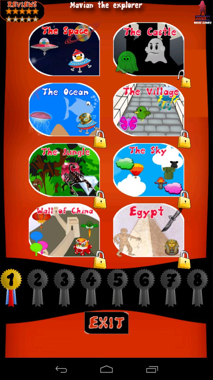 1. Espace: Mavian découvre une nouvelle galaxie et puis, soudain, il est attaqué par des extraterrestres qui veulent y trouver les trésors cachés. Pour passer le niveau, vous devrez réussir à être plus rapide qu'eux, obtenez des trésors et essayez de les éviter. Ayant atteint sa première médaille, Mavian peut passer à la prochaine mission.