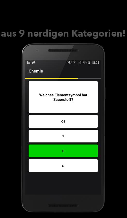 Avez-vous récemment appelé geek ou nerd? Voulez-vous devenir un geek ou un nerd? Quoi qu'il en soit, alors ce jeu est le bon pour vous! Juste dans le duel contre vos amis ou jouez contre le Nerdquiz Ai! Collectez les points atomiques en répondant correctement aux questions! Avec un grand nombre de questions, vous pouvez également en apprendre quelque chose.