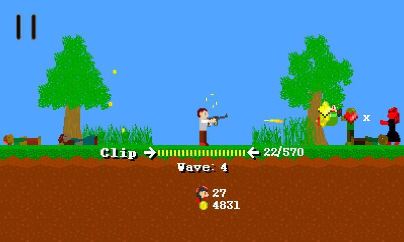 Survive as long as you can against wave after wave of zombies in this retro 8bit styled zombie game! Use simple taps to fire bullets. Tap your character to switch guns. Gain coins by slaying zombies and aliens with a handgun, a revolver, a shotgun, and a machine gun. Head shots do more damage. Spend coins on gun upgrades and new unlock-able guns like the flamethrower!