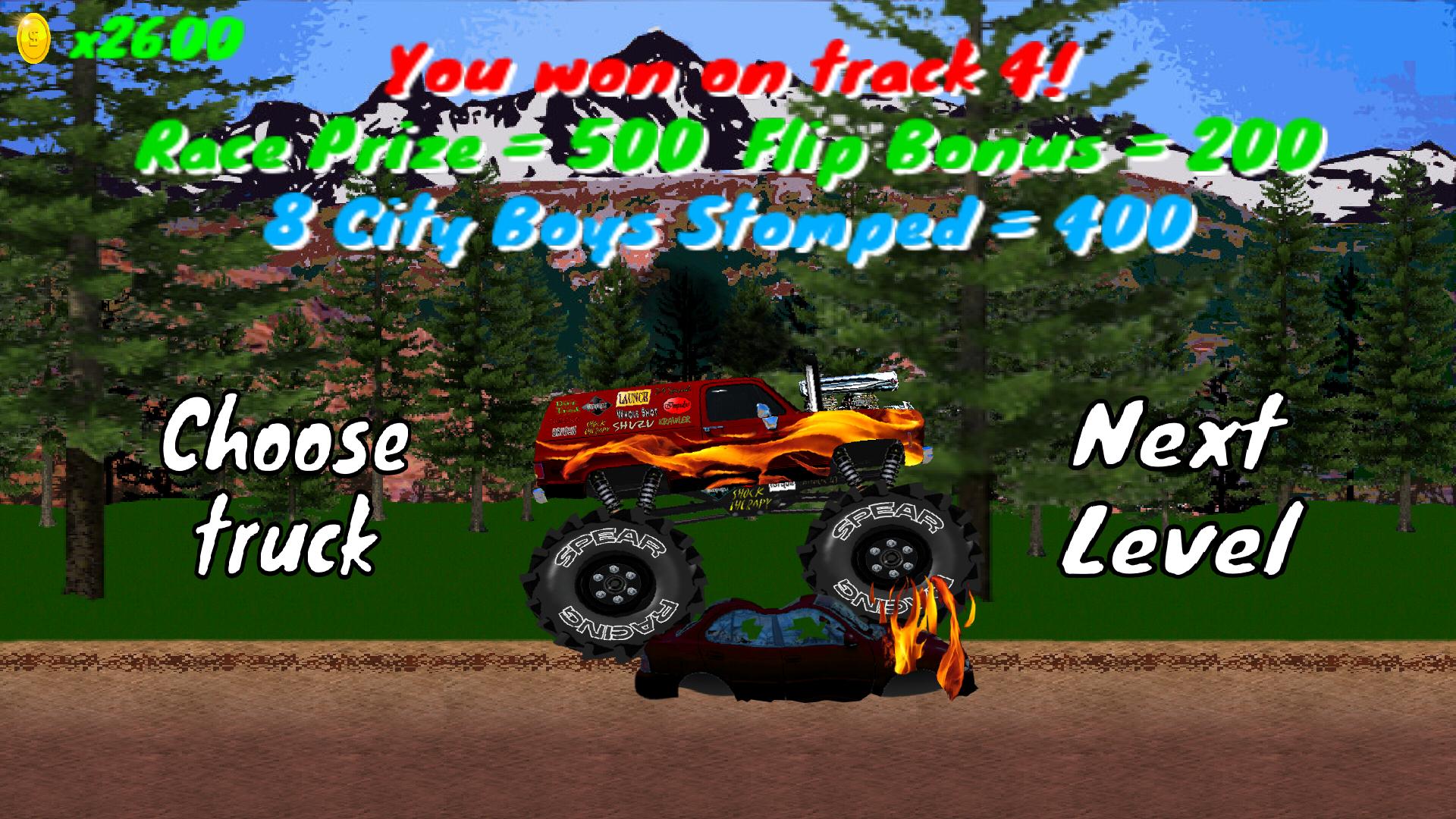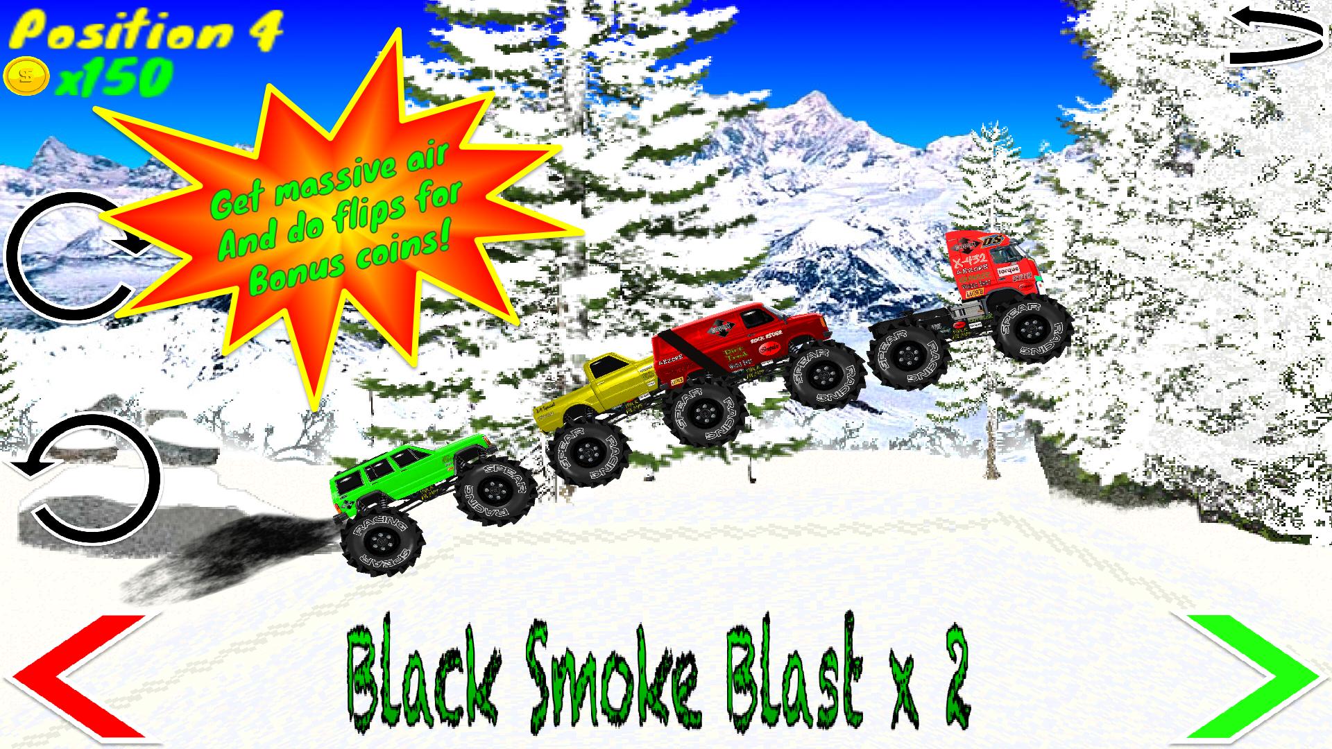Race against other jacked up diesel trucks and smash city boys for bonus coins along the way. Use your coins to buy new trucks, upgrade your speed, change your paint job, and buy new places to race. Bust flips as you get massive air off jumps to earn some style coins, but make sure you land on your wheels or you'll be no better than those country fried city boys. Hit the "BLACK SMOKE BLAST" to slam the pedal to floor and send out a big black smoke cloud from your smoke stacks. Share your high scores so other country boys can see how many city boys you stomped. Every 5th level is a "CITY BOY RAMPAGE" where you get to stomp a ridiculous number of city boys. Featuring many country dirt road race locations, and also a glacier where you’ll need to break out the snow tires.
