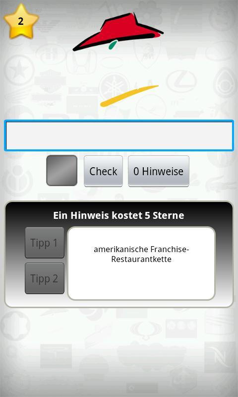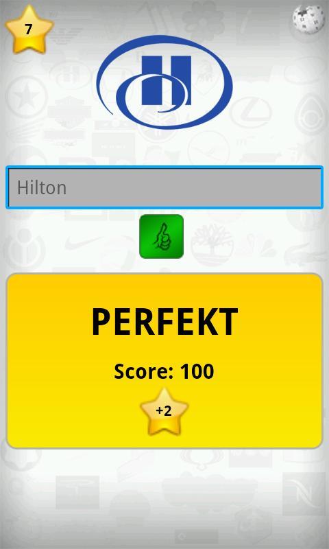 For every logo you can use 2 hints. Hint No. 1 substracted 7 points, hint No. 2 substracted 10 points. A hint coast 5 stars. Stars you can get if you solve a logo good or perfect.