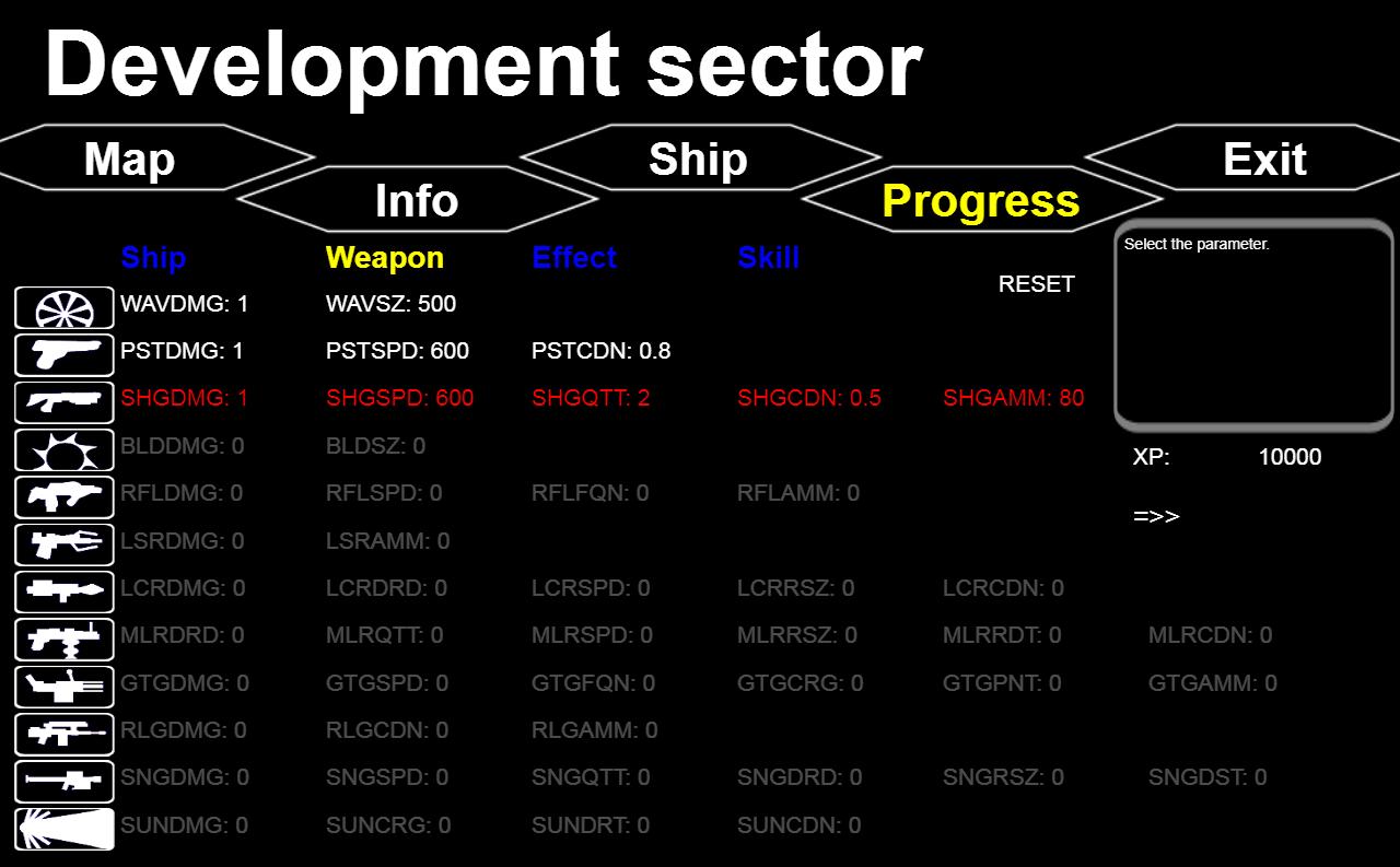 - Fly inside the available combat locations, destroy enemies and asteroids to gain experience points