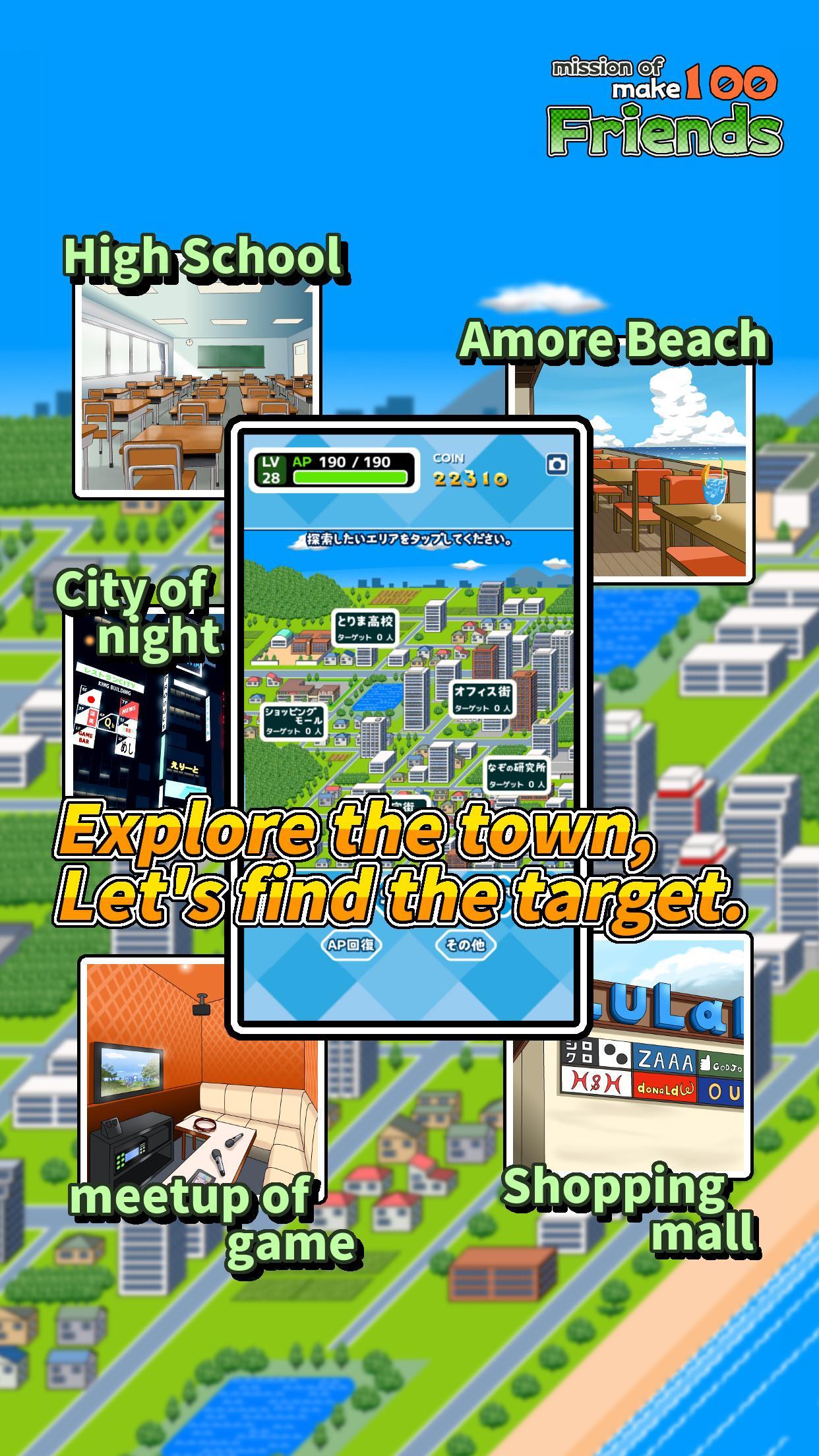 Let's explore various areas such as high school, Amore Beach, city of night, meetup of game and find the target.