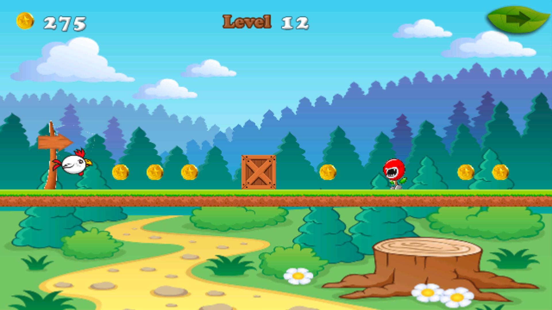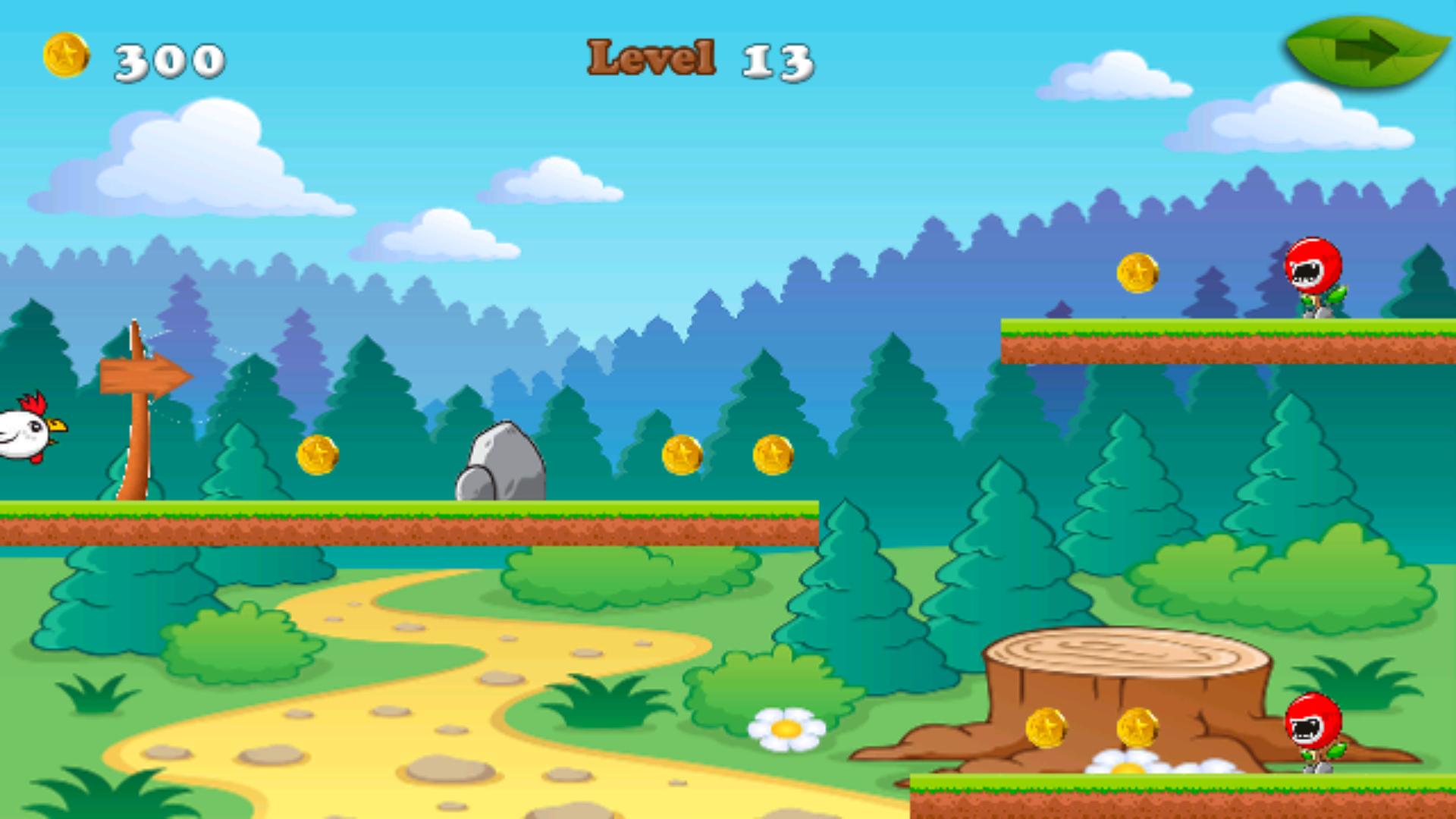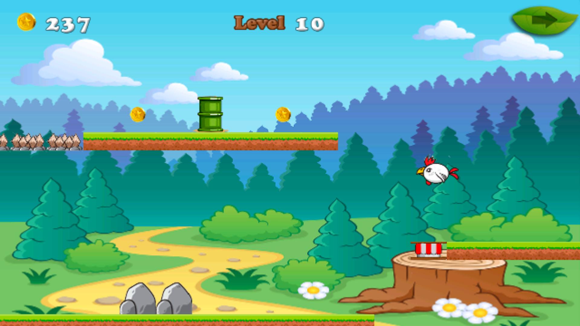 Tap screen or trackball to jump to avoid obstacles in your chicken adventure forest !