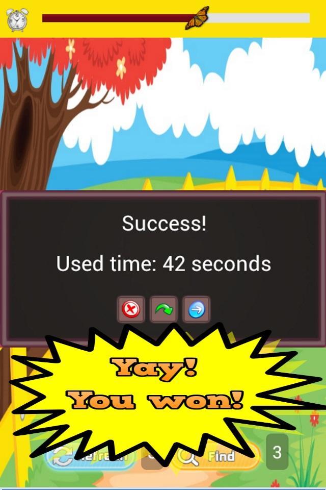 Butterfly Matching Game is a timed three round matching game, featuring different butterflies. It is designed for ages 2 & up and especially first time app users because of the easy-to-use interactive game boards. The first round in Butterfly Matching Game is 100 seconds and each consecutive round is 20 seconds less, so that each round is somewhat more challenging.