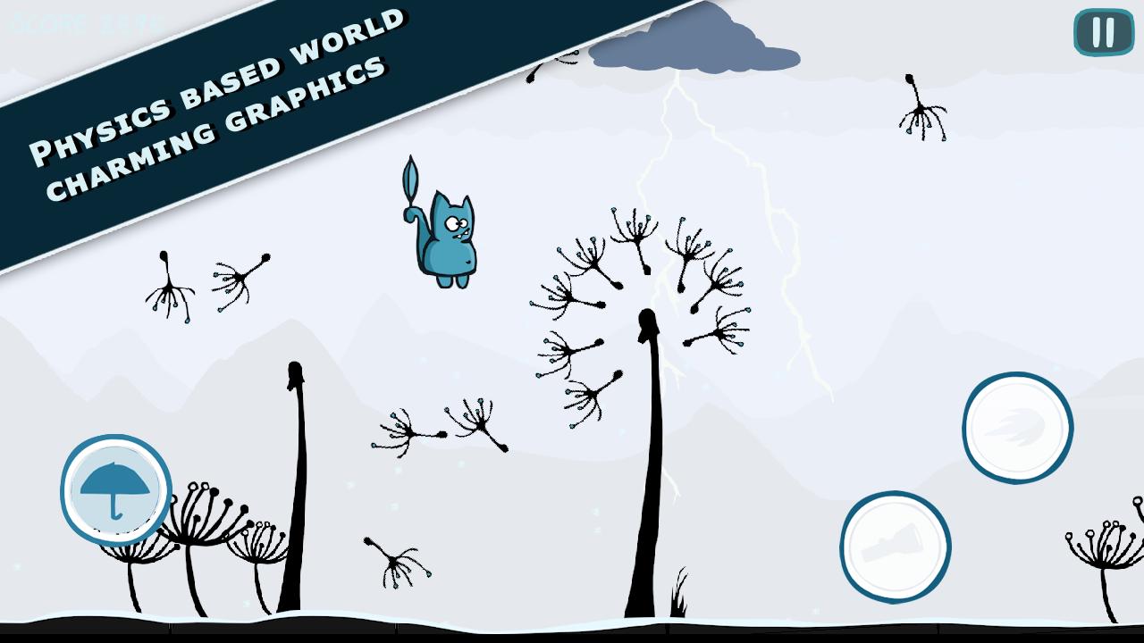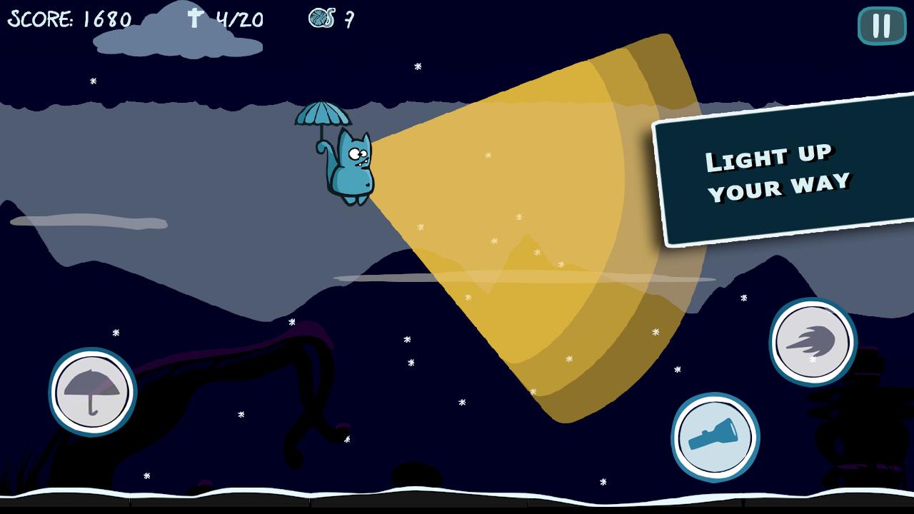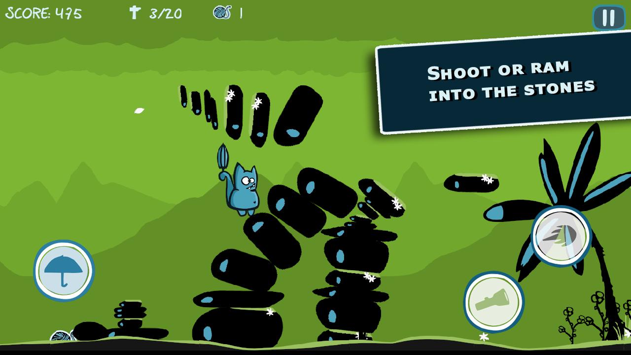 Bronko Blue, the kitten copter is an atmospheric side scroller. Bronko is a small blue cat who flies through the seasons and nightscapes searching for his lost wool. He must avoid or interact with obstacles along the way. The cat can shoot or ram stone towers or fight against windmills. Birds approach him which Bronko can shoot but not collide with. The missing balls of wool can be found along the way to receive bonus points. Bronko can use a torch to light his way in the dark.