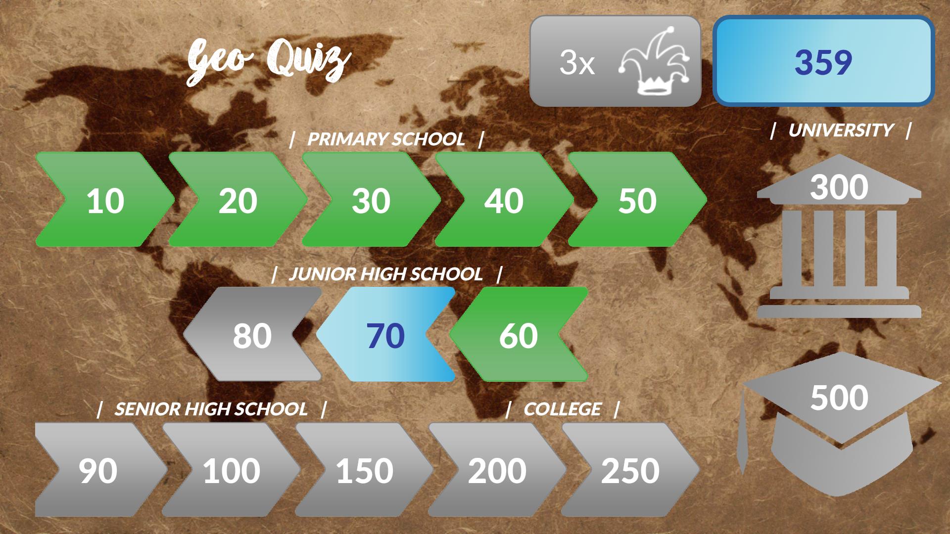 "Geo Quiz" offers you interesting questions about the topic geography. The quiz consists of approximately 800 questions in the languages "English" and "German". The questions are multiple choice questions which include one correct and three wrong answers. The quiz also includes "Image-Questions" where the question can only be answered with the help of a displayed image (can be disabled via game options menu).