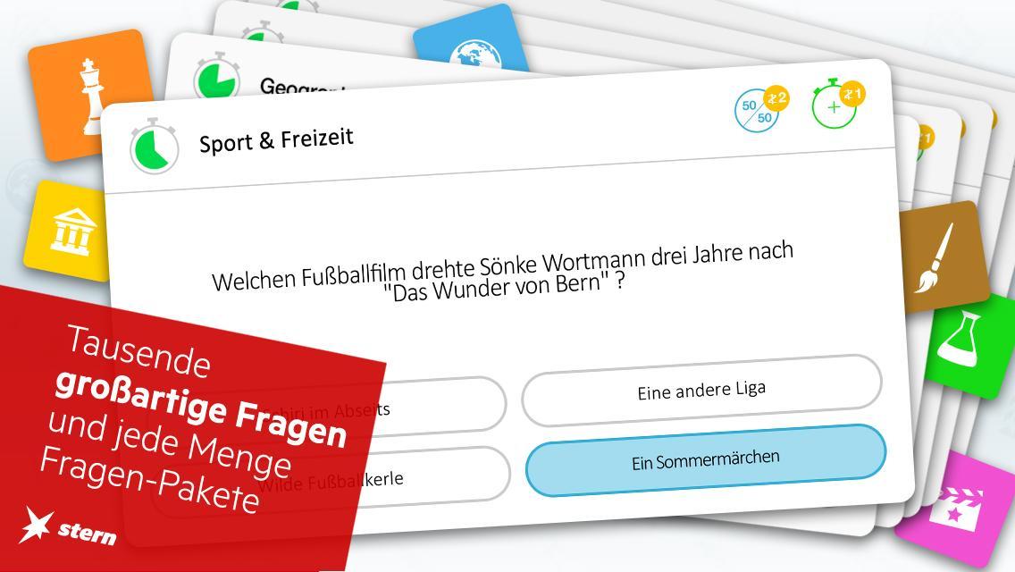 Put your general knowledge to the test – with stern Quiz Battle, a unique combination of knowledge tests and strategy game. Challenge your friends or play against randomly chosen opponents.