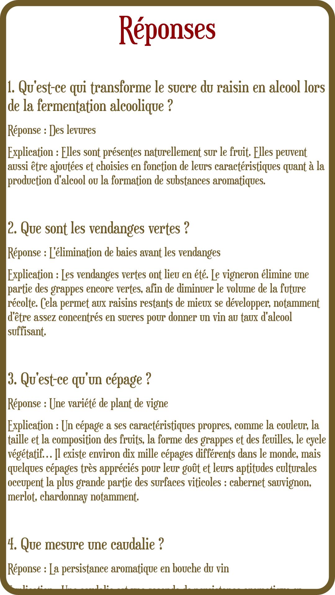 The questions follow in a progression. The answers simply explain the secrets of wine, its development, its tasting, the classification systems ...