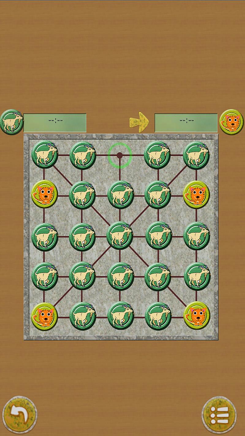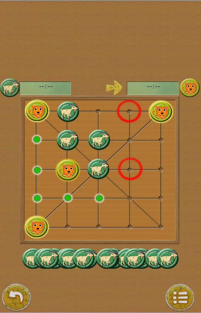 The game has two phases. In the first phase, the Tigers are put at corner of the board. Players take turns to plays and goats start first.Only tigers can move at the first phase. Once all goats have been placed to the board, the second phase started in which the goats can move too.