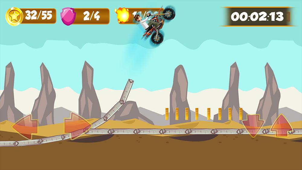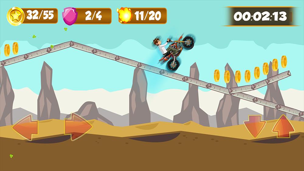With this ben-10 game Safety com's first So Please Wear your dirt bike helmets and your motorcycle leaper check your bike tires, add some incredible motorcycle accessories and Get Ready Because Now With ben Motocross 10 biker game you can do it,