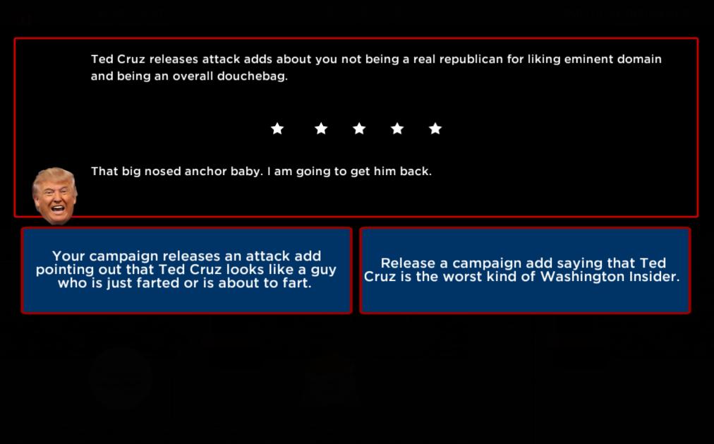 ALL SCENARIOS WILL BE UPDATED ATLEAST EVERY WEEK (WE AIM TO UPDATE QUESTIONS EVERY TWO DAYS) AS THE PRESIDENTIAL RACE 2016 GOES ON. SO DON’T BE A STRANGER AND CHECK TO SEE WHAT OUR LEADING MAN IS UP TO. YOU CAN ADD YOUR OWN SCENARIOS BY CONNECTING US WITH TWITTER OR FACEBOOK AND ADDING YOUR THOUGHTS USING #DungeonMasterTrump