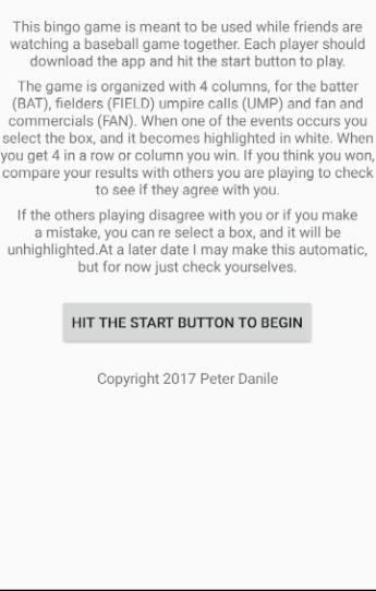 If you want to keep your favorite baseball teams game interesting over the weekend, try playing Baseball Bingo. It is a great way to help your friends stay involved in a slow moving game. Our games have items which are listed in 4 categories: batting (BAT), fielding (FIELD), umpire (UMP) and fan (FAN). After you and your friends have EACH downloaded the app, or gotten a free paper baseball bingo card, just start watching the game. As the plays occur or the commercials play, and you see one of the items on your card, shout out to the others in your party, and mark your card. When you get 4 in a row, column or diagonal you win. What you win is up to you and your group. You can try the game at your next party by downloading the free cards from our website baseballbingopro.com and trying it yourself. This game is meant to be played with small groups, and you are encouraged to shout out when you see something on your card and argue the point with your friends while you are playing. If you want, make up your own rules, like setting a time limit. We hope you enjoy our games.