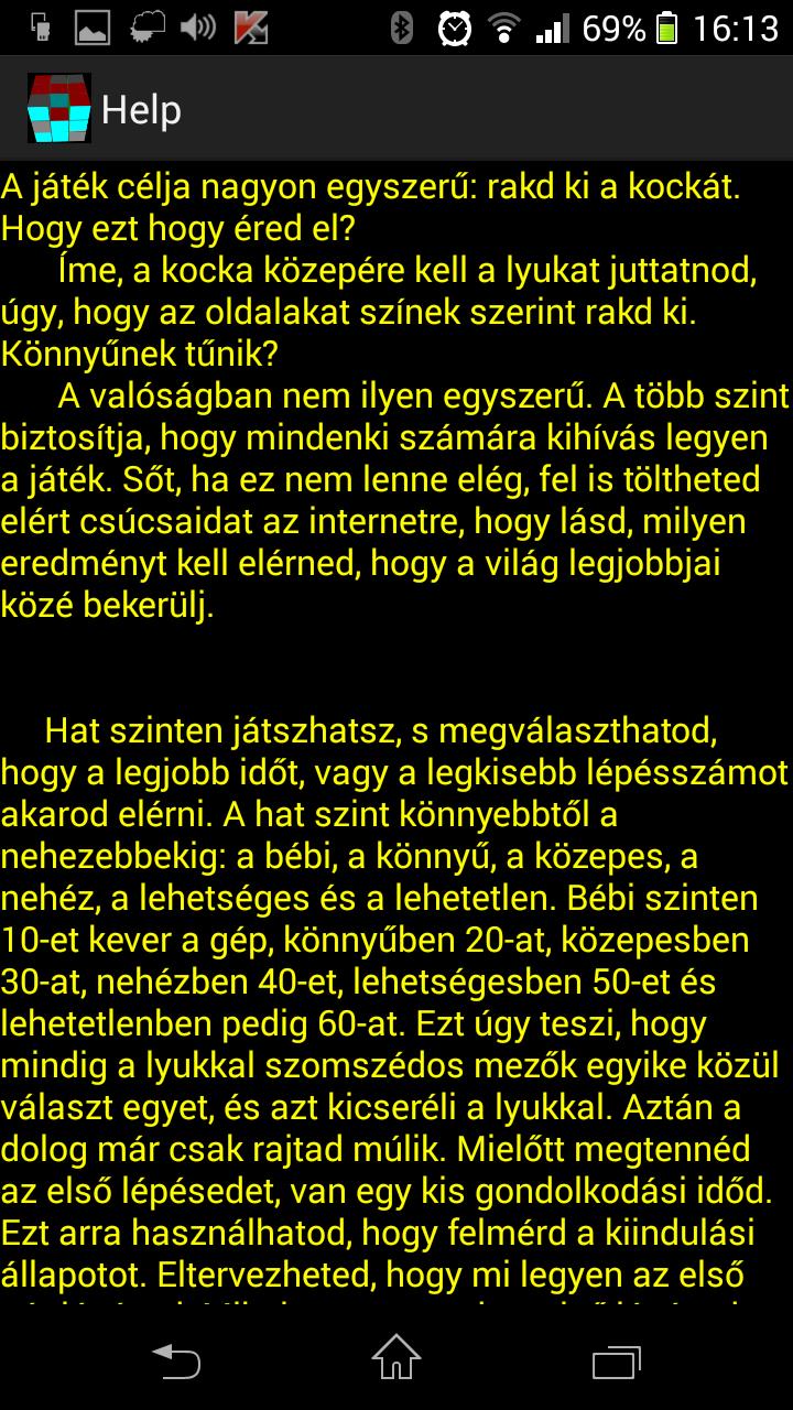 You can also try the game in „Exercise”. Here it does not matter how fast you are or how many steps you need. This mode helps you to decide if you take the right decisions: on top of the screen, a counter shows you how many steps you have already taken and the minimum number of steps that is needed to solve the cube from that position. If this number keeps decreasing, you are on the right track.