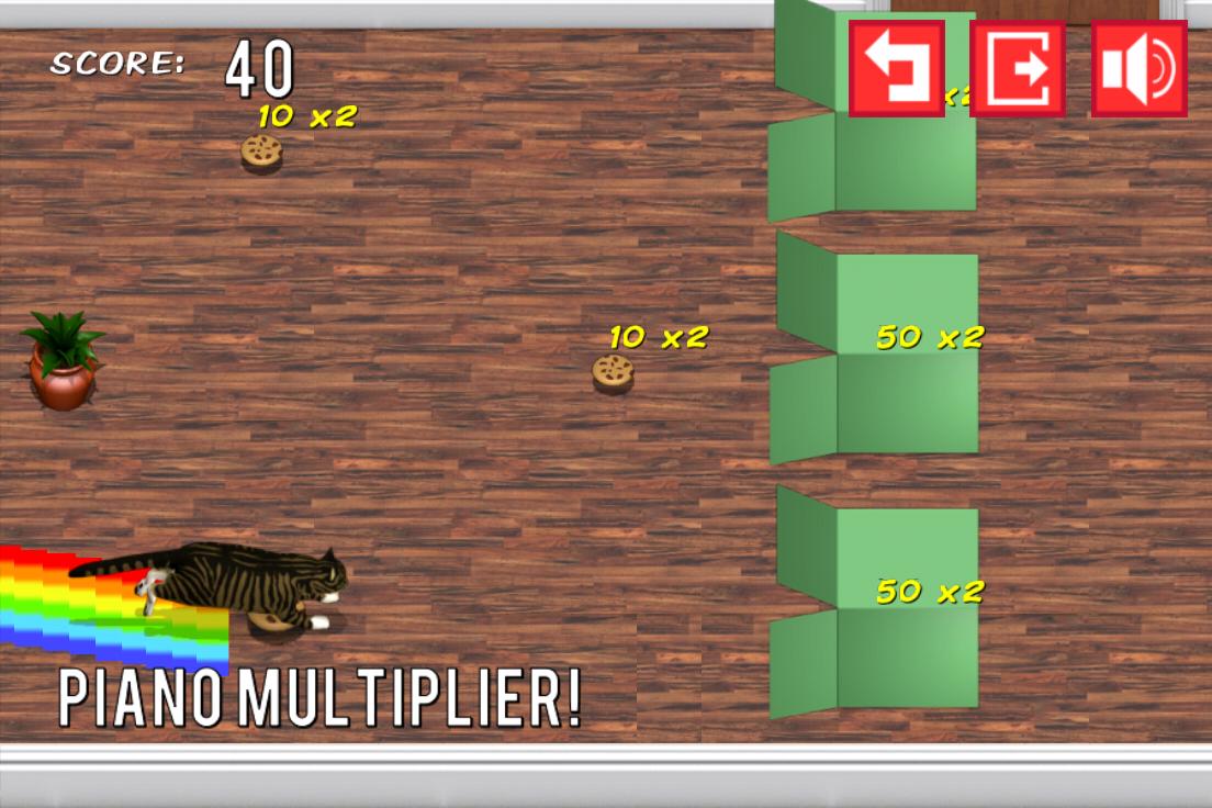 Launch the cat into the box! Eat the cookies and cheezeburgers, aim for the bonuses, avoid the obstacles and go for the biggest score in each room.