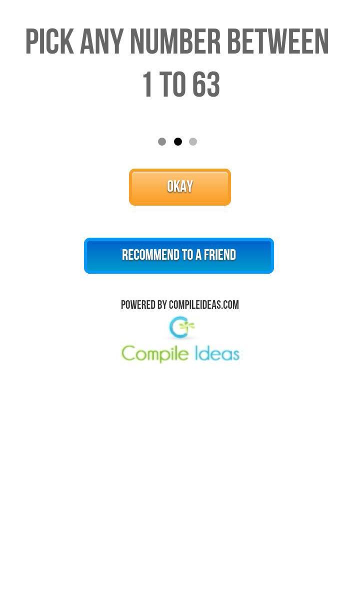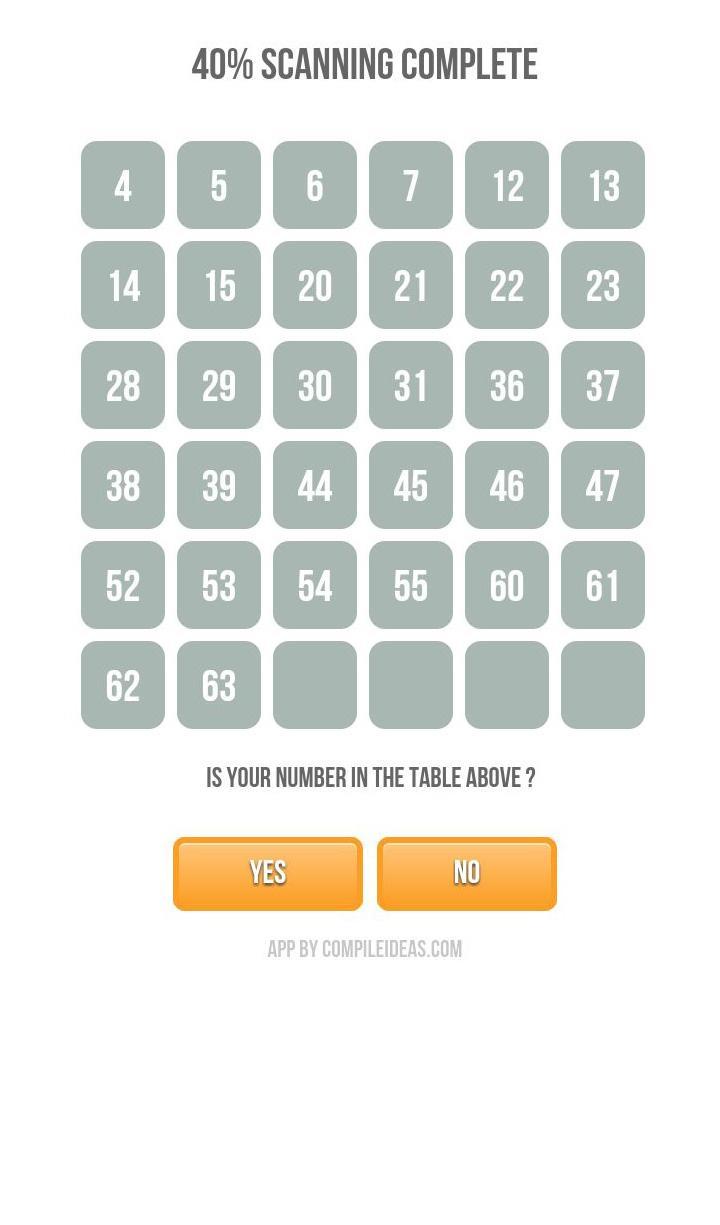 Anda memikirkan angka antara 1 dan 63. Aplikasi akan menunjukkan kepada Anda 6 slide. Jika nomor Anda ada di slide maka klik Ya. Kalau tidak, klik No. Di akhir itu akan menebak nomor Anda.Bug Fixed- Output Salah Saat Pengguna Memilih 56 Nomor