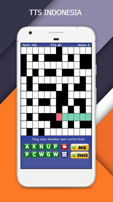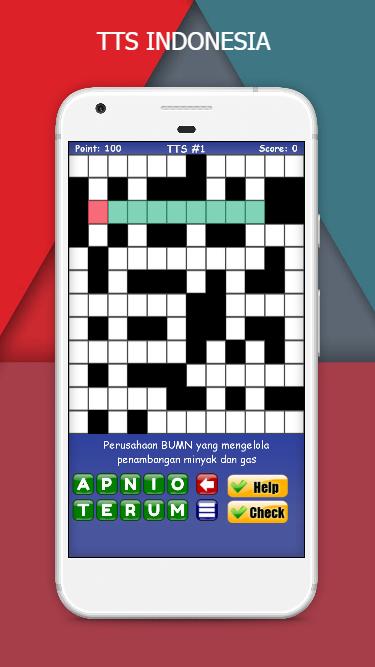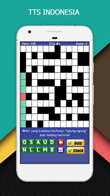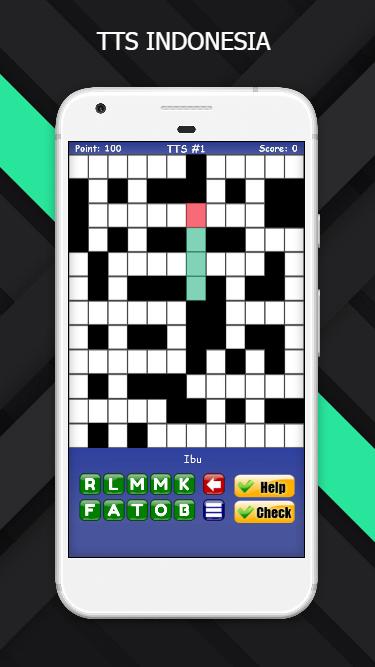 Teka teki silang merupakan permainan kata paling populer di Indonesia. Dalam permainan TTS Indonesia ini anda harus mengisi kotak putih yang membentuk sebuah kata dari jawaban atas pertanyaan yang diberikan. Anda dapat mengisi dengan susunan kata mendatar dan susunan kata menurun. Asak otak Anda dengan soal-soal yang menguji pengetahuan dan wawasan Anda. Berisi ratusan soal TTS dengan berbagai tingkat kesulitan. Tekan "Help" jika anda mengalami kesulitan, dan tekan "Check" untuk mengetahui kebenaran jawaban.