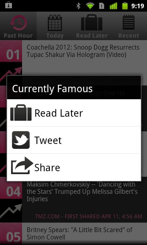 洗練されたアルゴリズムを使用して、Twitterを監視して有名人のニュースを流し、知る価値があるときはいつでもお知らせします。 Currently Famous 、トップ50の見出し(15分ごとに更新)を特徴とするチャートを通じて、有名人のニュースのトップにとどまり、レッドカーペットから携帯電話に直接ニュースを送る通知を特徴としています。また、ヘッドラインを保存して後で読み、メール、Twitter、Facebookを介してFriendsとHot Gossを共有することもできます。