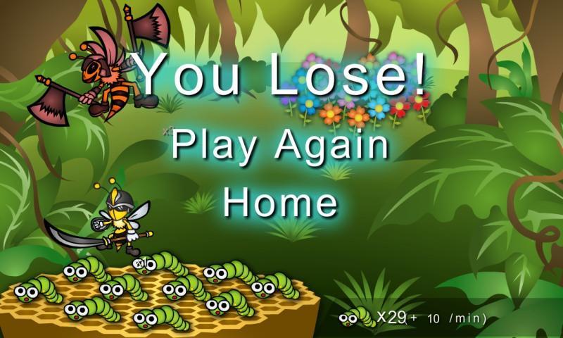 あなたの雄大な帝国は、豊かな資源とよく構築された植民地が領域全体に広がっていることで、その平和と繁栄を長い間楽しんできました。しかし、あなたの野心的な隣人であるホーネッツ王国は、あなたの故郷に貪欲な目を投げかけています。激しいはんだの大群は、土地をつかみ、植民地化するという目標だけで帝国に侵入するために送られます。軍隊を成長させて悪意のある侵入者を追放することで、その日を救う必要があります。ゲームが始まると、幼虫は左下隅でゆっくりと1つずつ成長します。幼虫の上には、繁殖するための3種類のミツバチを含む選択パネルを見つけることができます。一番上にあるのは、敵を守る兵士です。真ん中にあるのは労働者の蜂であり、それは来る量の資源を増やすことができます(もちろん蜂蜜)。パネルの一番下にあるのはドローンで、幼虫の出生率を繁殖および増加させます。ミツバチの各タイプは、成長するために特定の量のリソースが必要であり、これは選択パネルの右側に示されています。ハチの種類を育てるには、パネルの対応するアイコンをクリックするだけです。現在の着信率は画面上部に表示され、幼虫の出生率は右下に表示されます。ホーネットの波が来ると、画面の右側にタイマーが表示され、準備の残りの秒を示します。敵が到着すると、彼らはあなたの帝国のメンバーを攻撃し始めます。メンバーは暴力的な攻撃を受けているときに排除されますが、より良い防衛のために戦いの間に新しいメンバーを継続的に成長させることができます。あなたの兵士がすべて敗北した場合、ホーネッツは左上隅の蜂の巣に到着し、それを破壊しようとし、ハイブが完全に壊れている場合、あなたはゲームを失います。侵入者の波が排除された場合、ホーネッツは一時的に火を止めますが、すぐにより大きく強い軍団で戻ってきます。 9ラウンドの暴力的な波の後、クイーンホーネットは最終的な戦いに直接参加し、勝利を宣言するために彼女を倒す必要があります。悪魔を排除し、あなたの最愛の帝国に平和を戻してください!