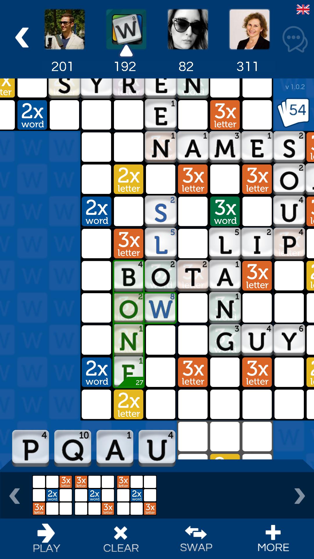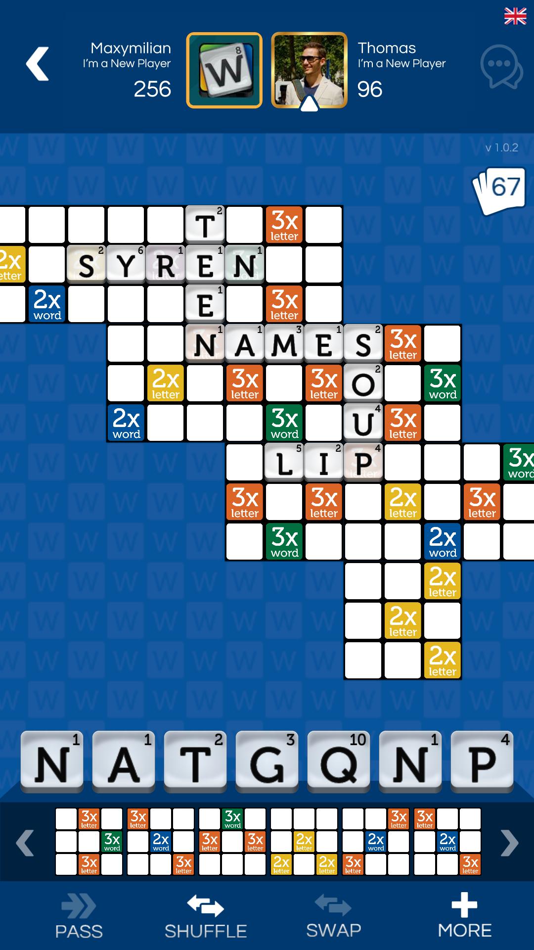 • 게임은 모두 115 개의 문자 타일을 모두 사용하고 플레이어에게 문자가 남지 않거나 모든 사람이 통과 할 때 끝납니다.