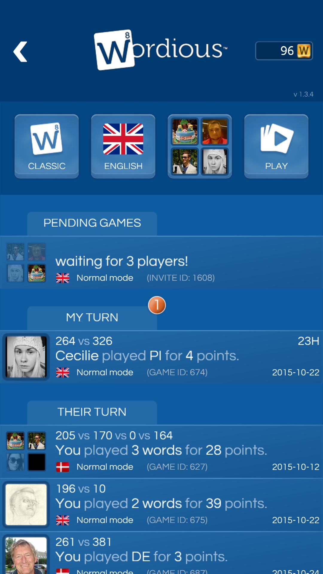 • Facebook Friends, Wordious Friends 또는 The Wordious 커뮤니티의 임의의 선수와 함께 플레이하십시오.