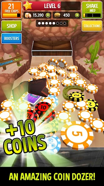 Use the special boosters to win even more. The Chip Wall booster and the Tornado give a great sensation in the game! Collect all treasures and complete the collections to upgrade your coin dozer and features.