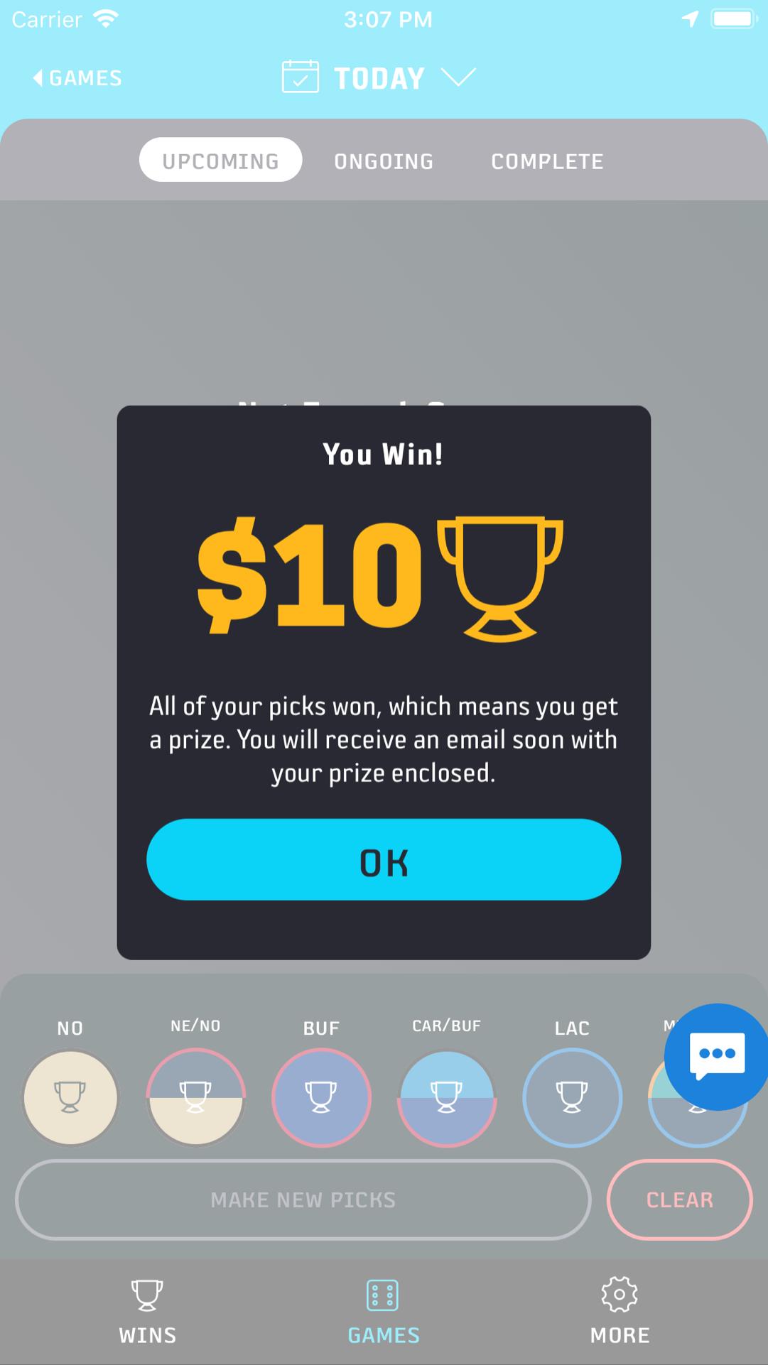 플레이하기가 쉽습니다. 다가오는 일일 게임 일정 (축구, 야구, 농구 및 하키 게임 포함)에서 이길 것이라고 생각하는 6 개의 팀을 선택하십시오. 6 개의 선택이 모두 실현되면 $ 10 기프트 카드를받을 것입니다. 후원 스포츠 바에서 플레이하는 경우 상금은 해당 스포츠 바에 100 달러의 기프트 카드입니다.