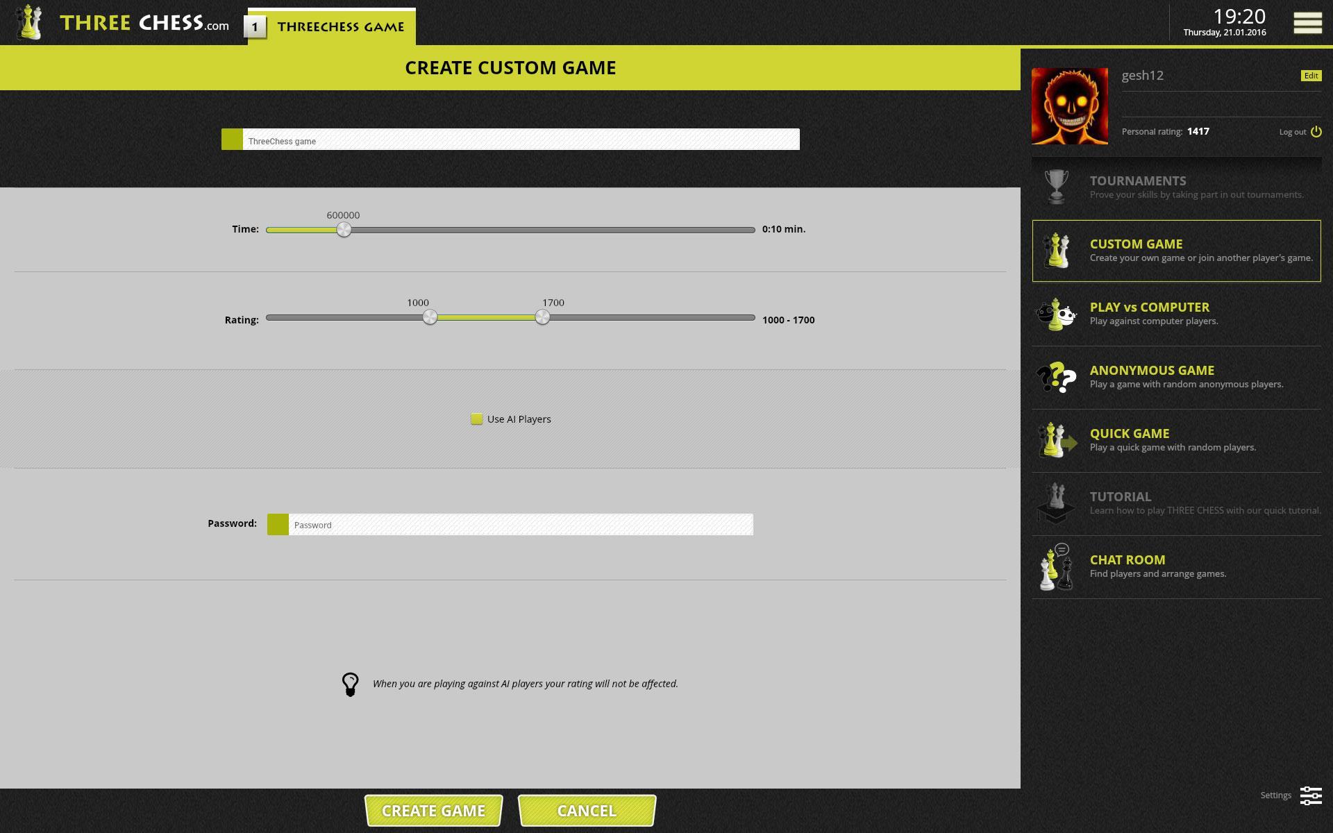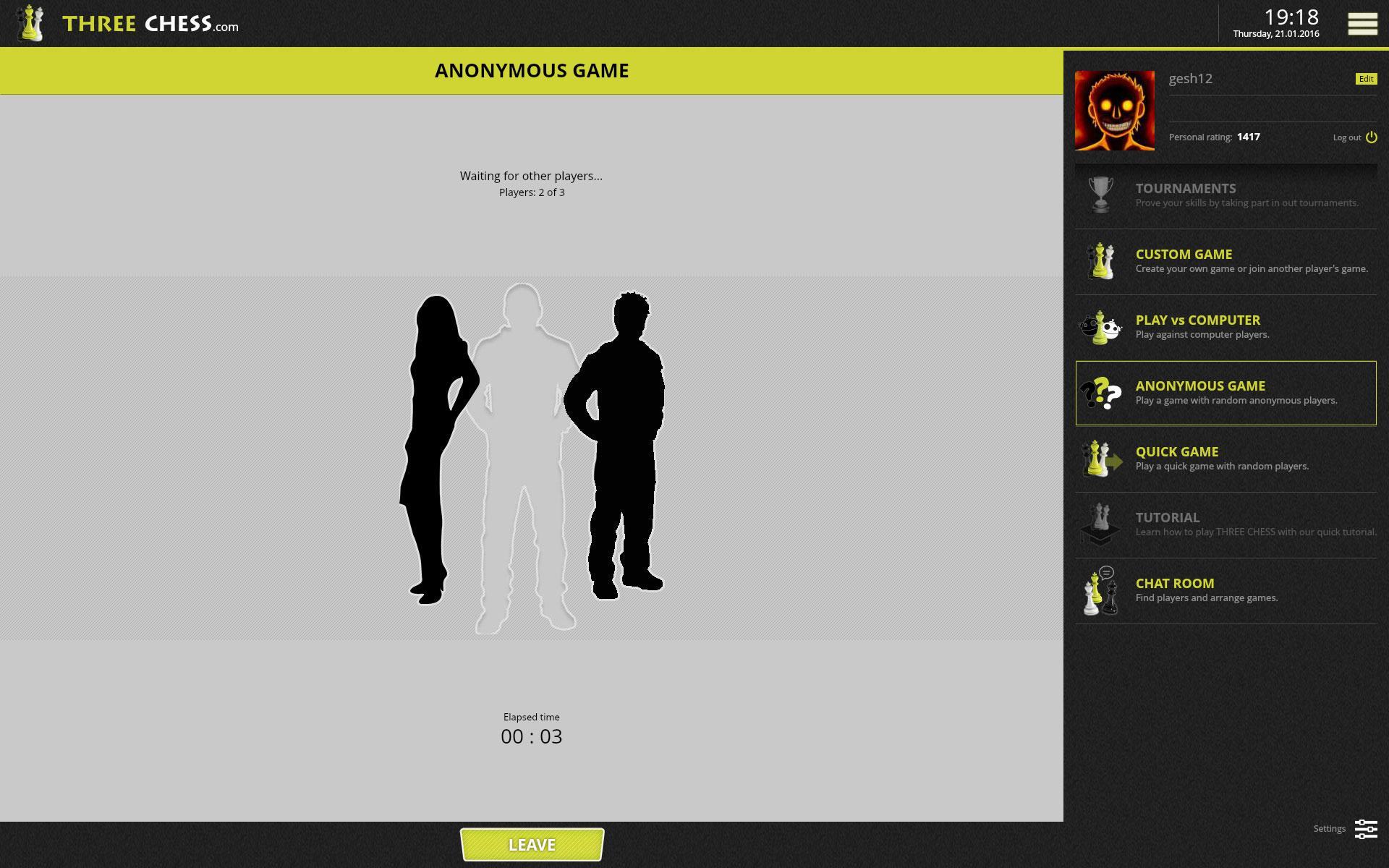 THREECHESS : 온라인에서 친구 또는 Computers와 함께 3 명의 선수를 위해 체스를 플레이합니다. 토너먼트에 가입하십시오.